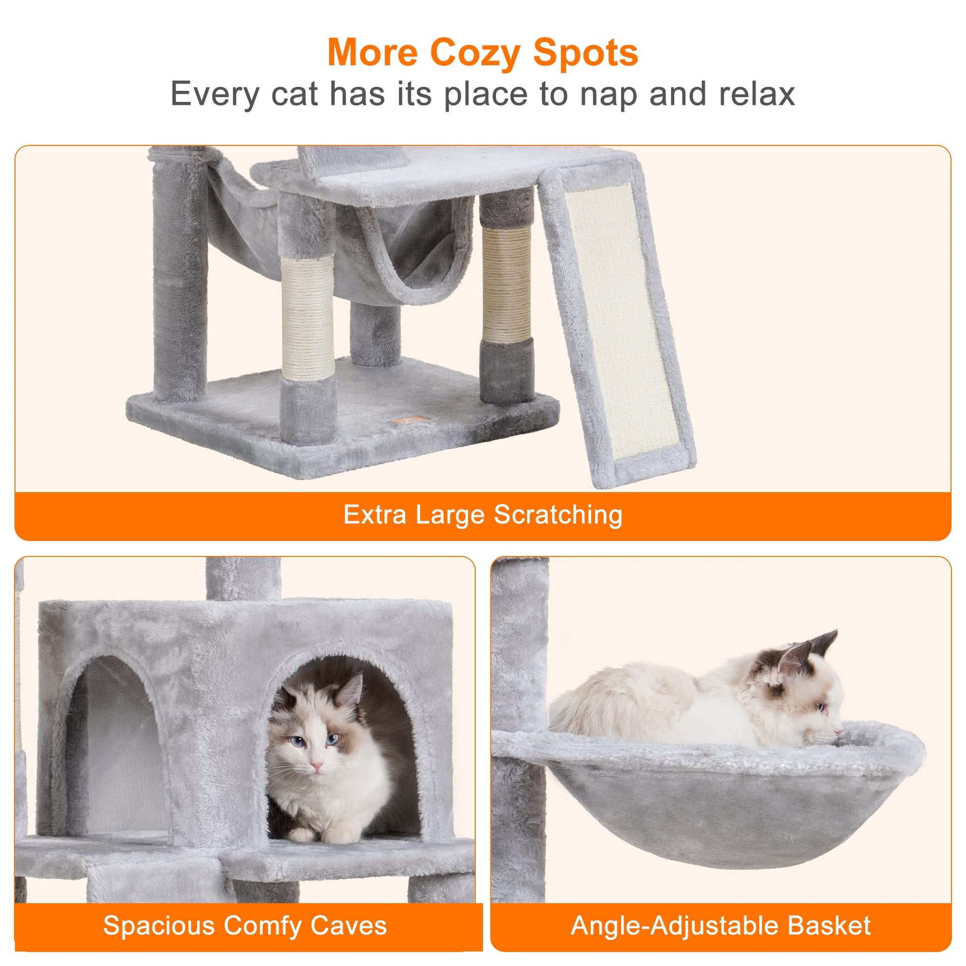 Heybly Cat Tree, Cat Tower for Indoor Cats, Multi-Level Cat Furniture Condo for Cats with Padded Plush Perch, Cozy Basket and Scratching Board, Light Gray HCT014W