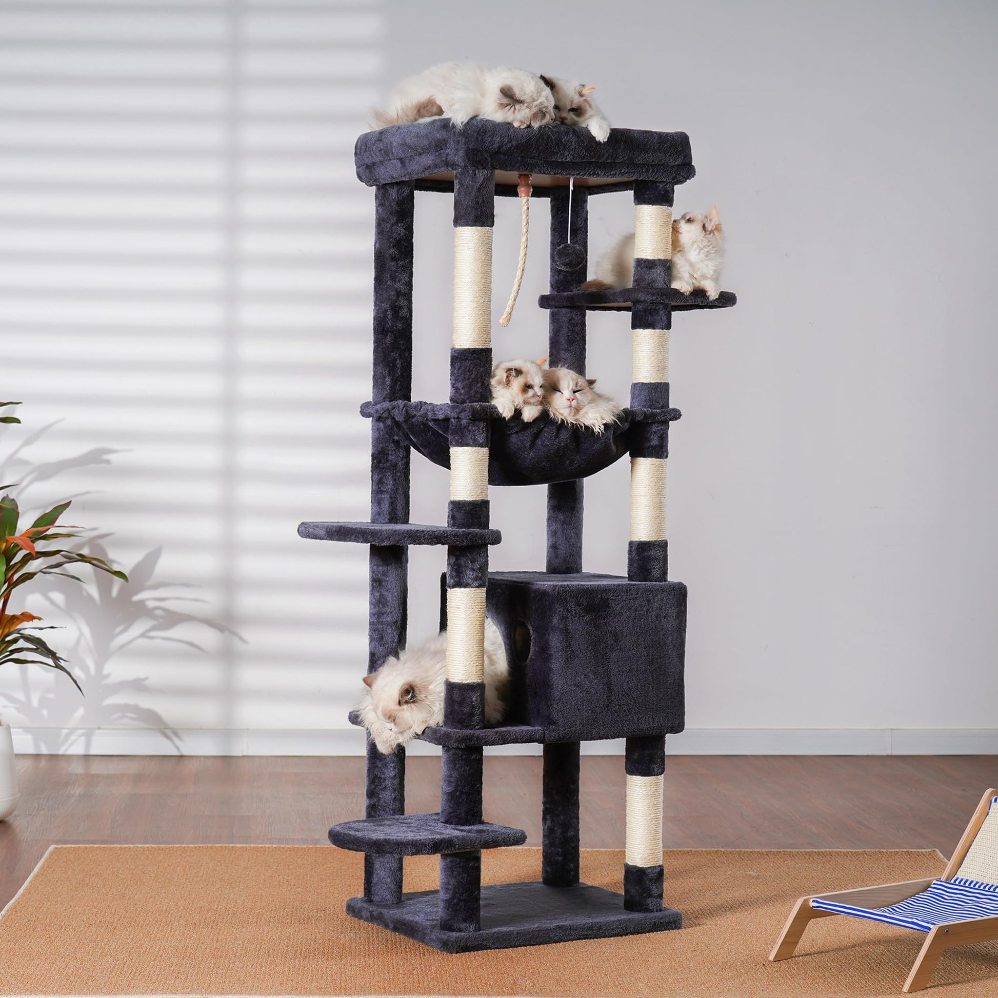 • Stability is the primary consideration for a cat tower: Reinforced cat climbing frame base, sisal wrapped scratch posts and Anti-toppling devices ensures the security of active kittens and cats playing on the activity center