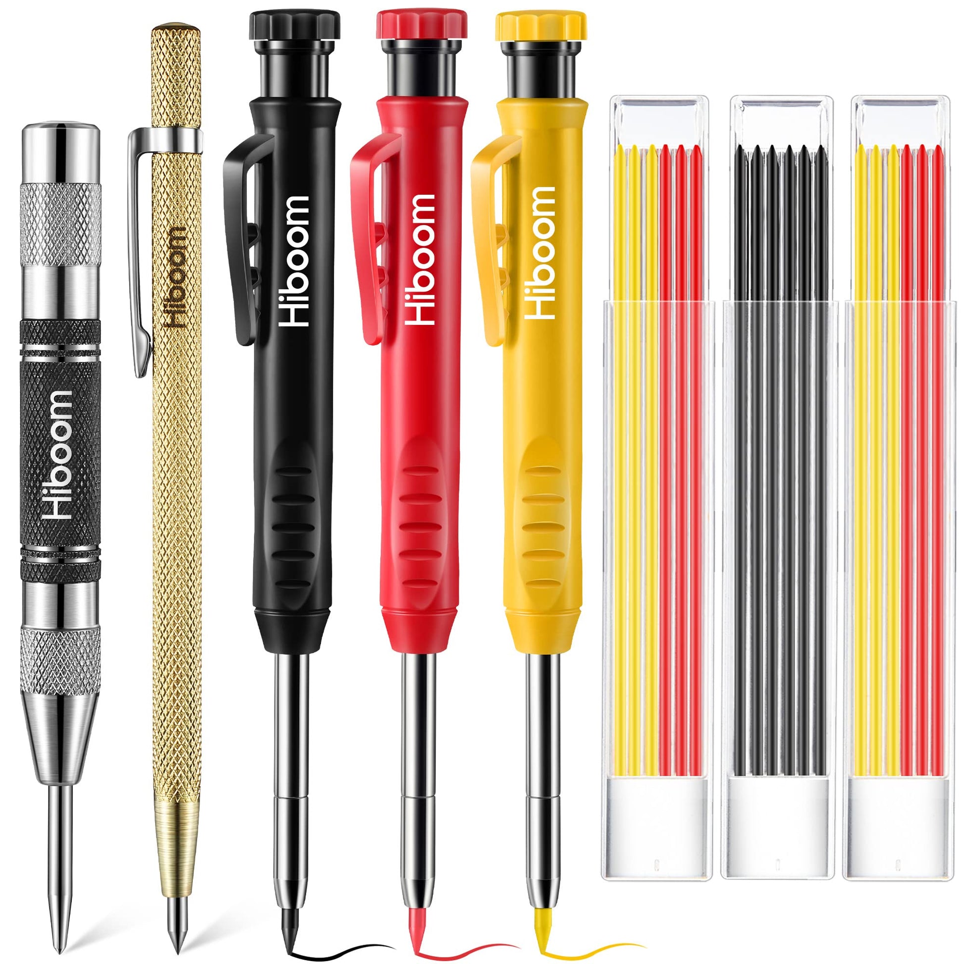 • Full Set Carpenter Marking Tools: this Hiboom carpenter pencil kit include 3 pieces solid deep hole mechanical carpenter pencil with built in sharpener, 18pcs marker refills, 1 piece automatic center punch tool and 1 piece carbide scribe tool; Multiple tools can meet your different marking needs in working