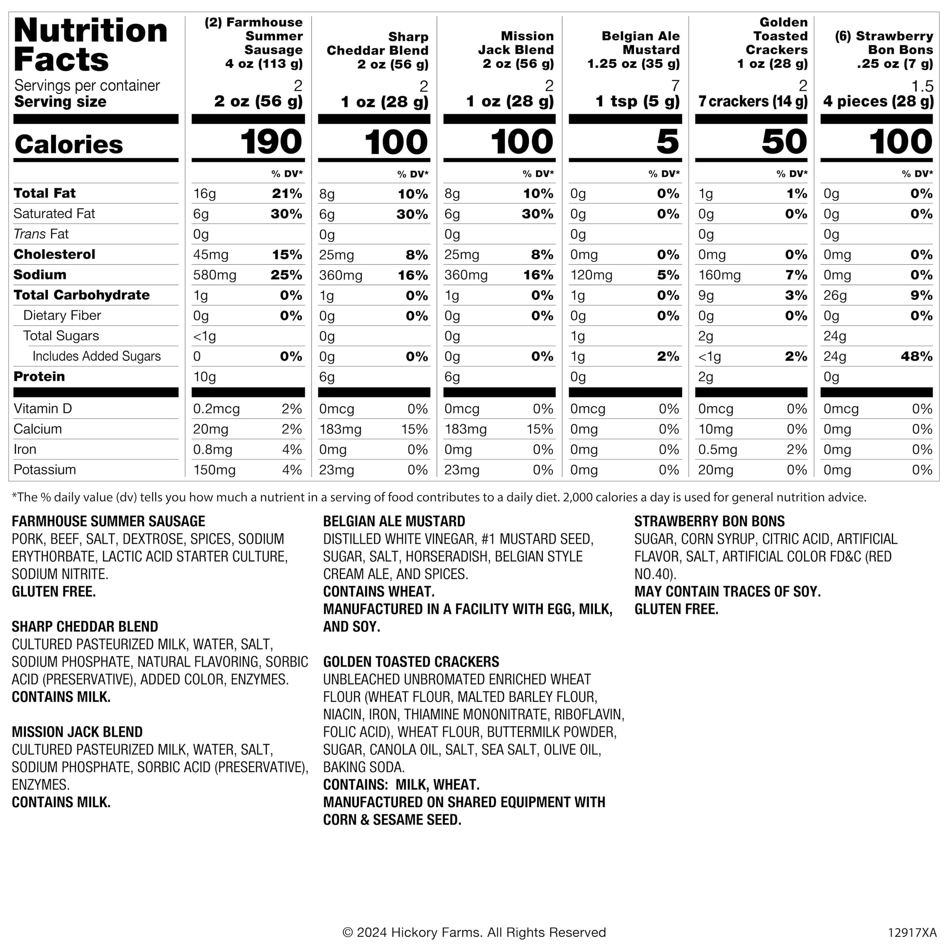 • Gourmet Condiments: Crackers & Sweets - 1.25 oz Belgian Ale Mustard, 1 oz Golden Toasted Crackers, (6) 0.25 oz Strawberry Bon Bons