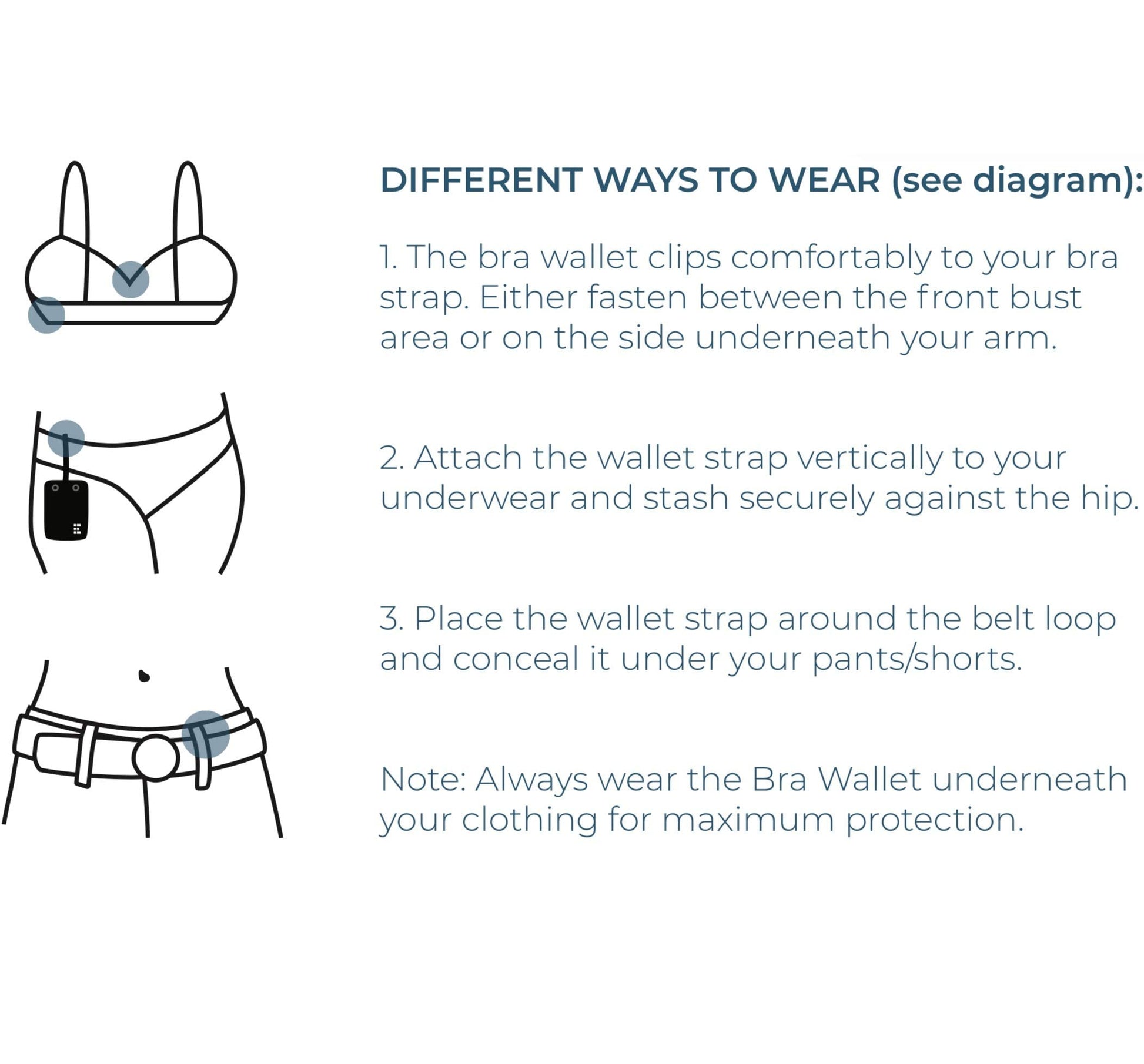 • PROTECTS YOUR VALUABLES - Subtle yet secure, the bra wallet conceals your essentials such as passport, ID, cash, credit cards & other valuables from pickpockets. Secure Connector Clasp & Double Snap closure ensures your items are safe.