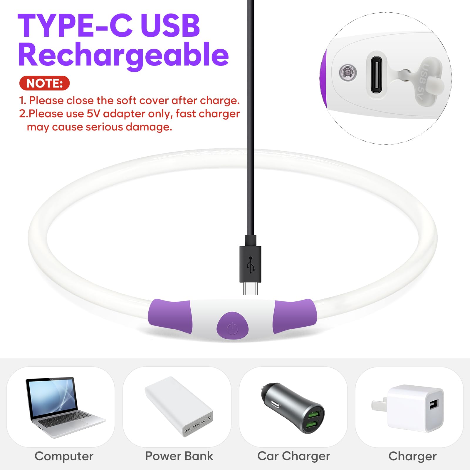 • 💕Type-C Rechargeable Dog Collar Light: Chargeing via included Type-C cable (works with laptops/power banks). The led dog collar 1-hour charging lasts 8 hours. Never hunt for button batteries again.
