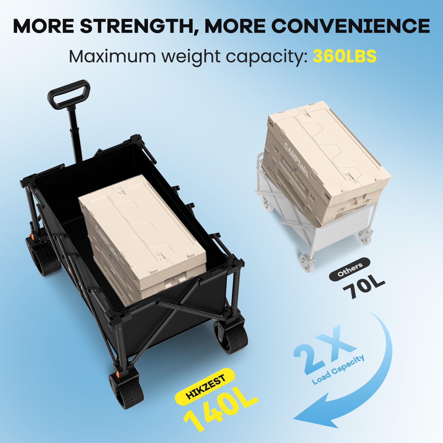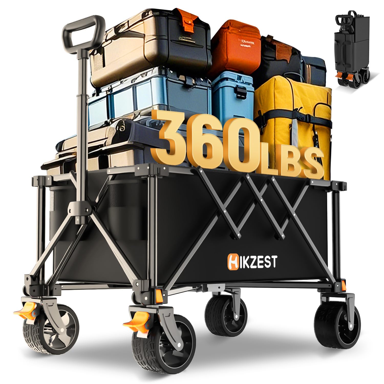 Hikzest Collapsible Wagon Cart Foldable, 360LBS Heavy Duty Utility Wagon, Beach Wagon with Wider Wheels, Portable Grocery Cart for Camping, Shopping, Garden, Sports, Black