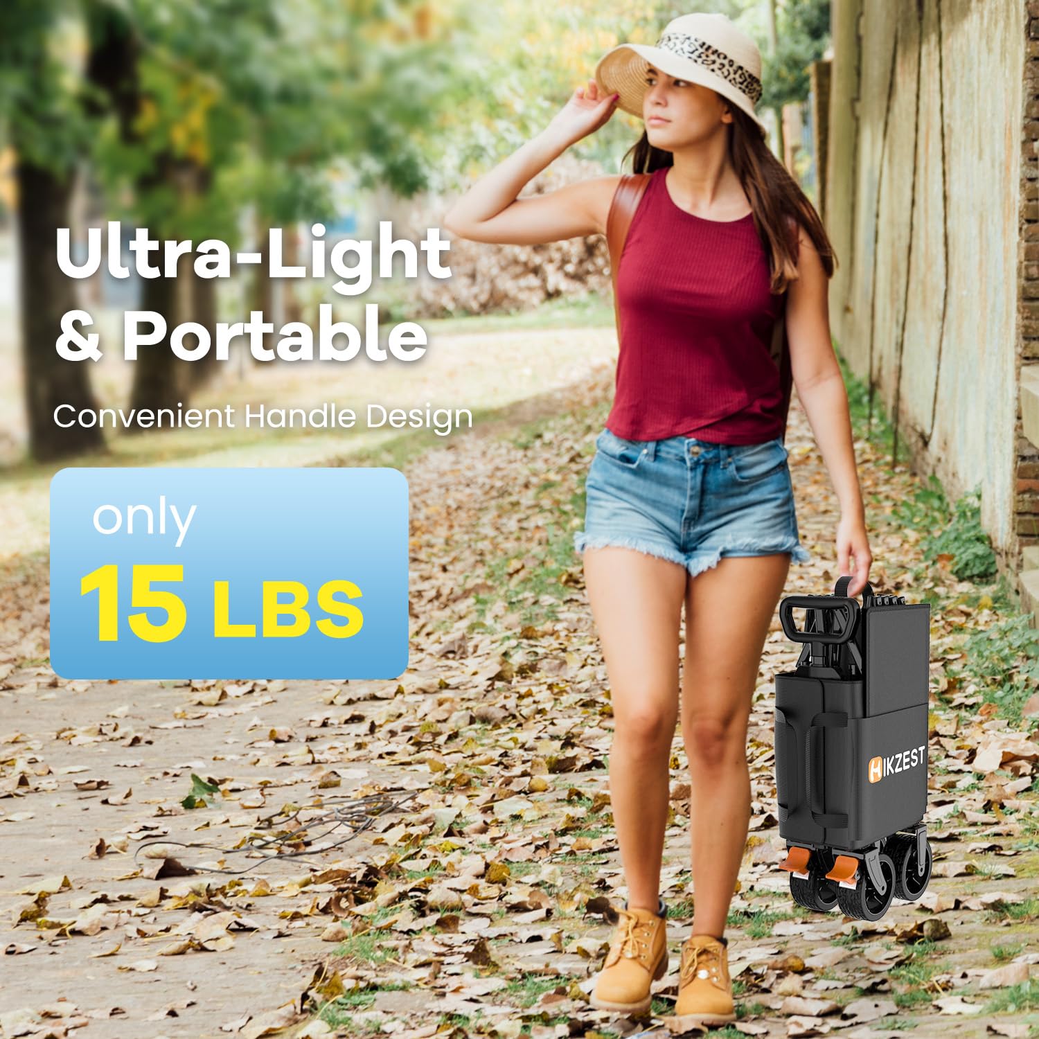 • ▶Super Compact & Effortlessly Portable: The Hikzest collapsible wagon cart is a marvel of ingenuity, with its innovative four-way fold, it transforms into a sleek, compact package that slides seamlessly into even the tightest of spaces. And weighing in at a feather-light 15 pounds, it's a cinch to tote around or tuck away in your trunk – no heavy lifting required! Say hello to hassle-free transportation that takes up barely a quarter of your car trunk or closet space, freeing you from the burdens of backaches and muscle strain.