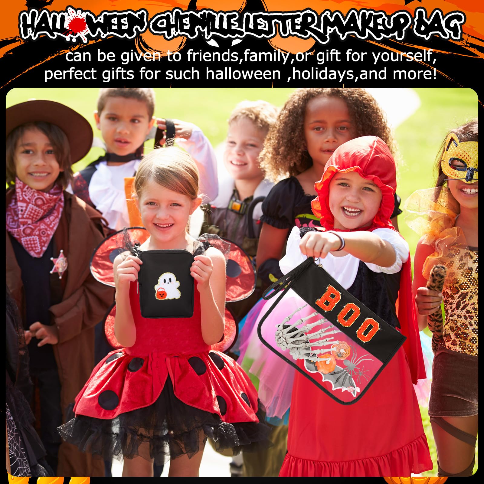 • Chenille Letter Cosmetic Bag: there are 2 pieces of Halloween boo bags with 2 different designs, large one is firmly embroidered with the letter patch [BOO] and golden glitter border, small one is designed with a ghose with pumkin patch, stylish and novel appearance is favored among women