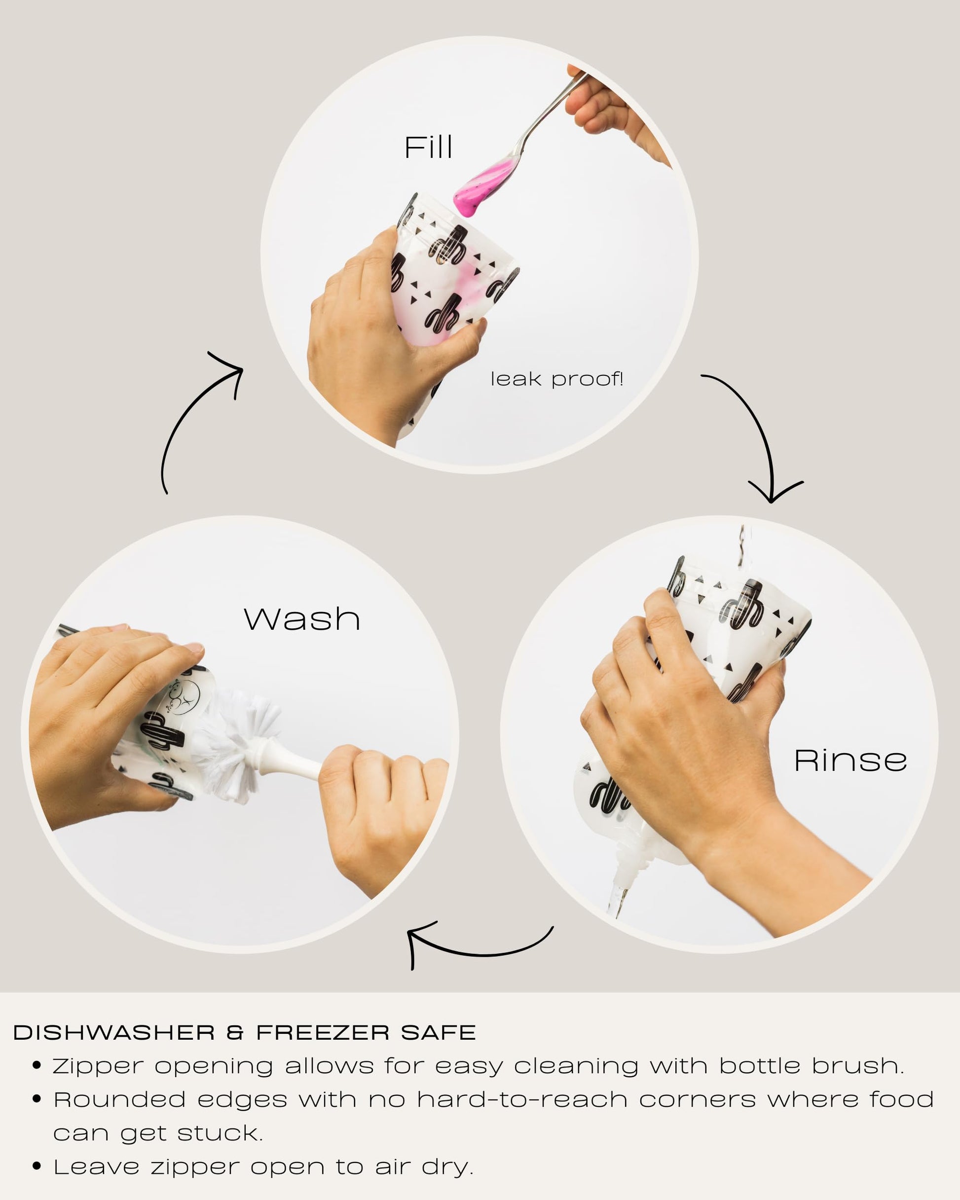• ✔️ DISHWASHER & FREEZER SAFE: Our pouches are easy to clean and top rack dishwasher safe. The zipper opening allows for easy cleaning with a bottle brush. The pouch design features rounded edges with no hard-to-reach corners where food can get stuck. Make sure to open the spout and rinse out before placing in the dishwasher. Leave the zipper open to air dry. Hand washing will extend the life of your pouches and zipper closures.