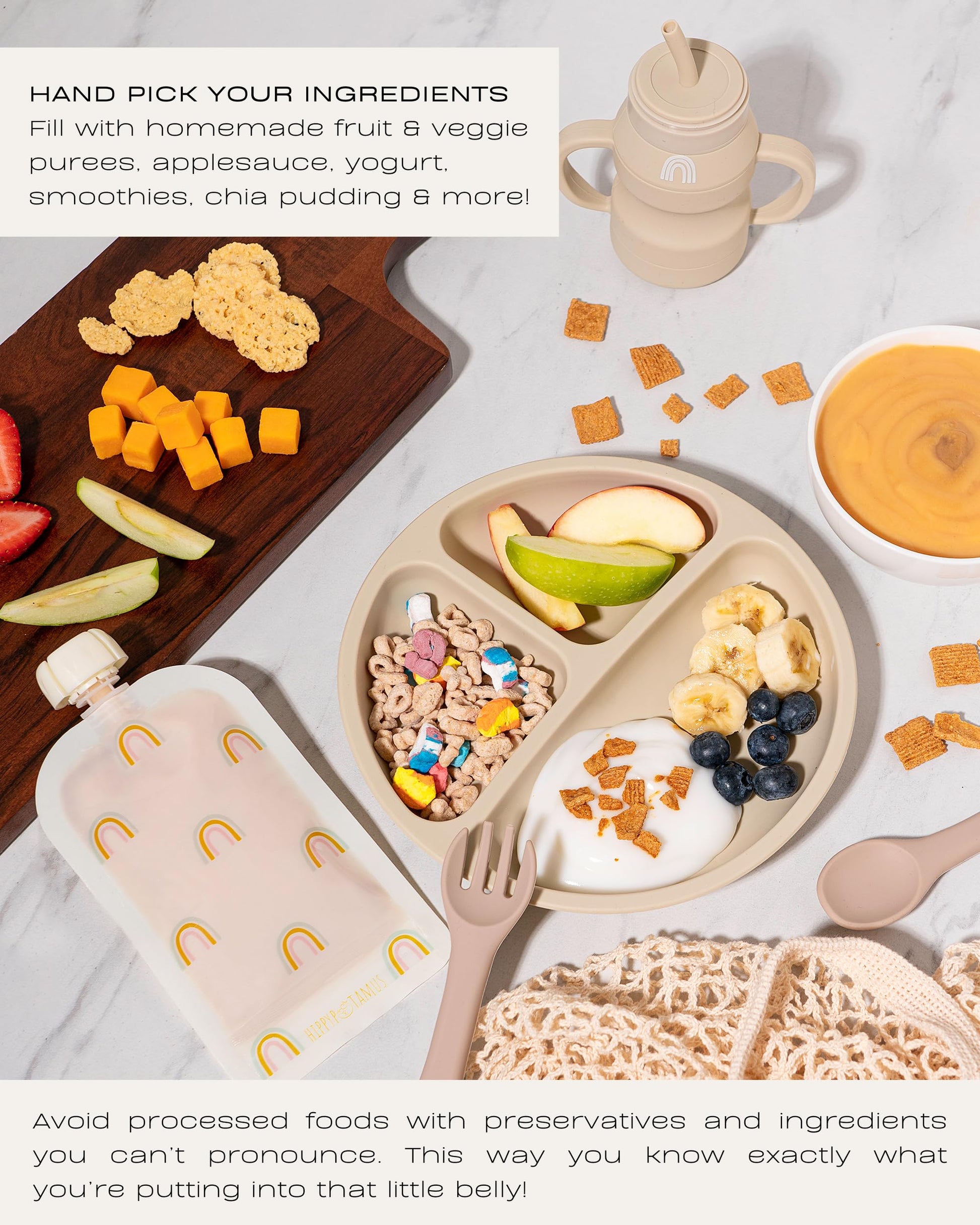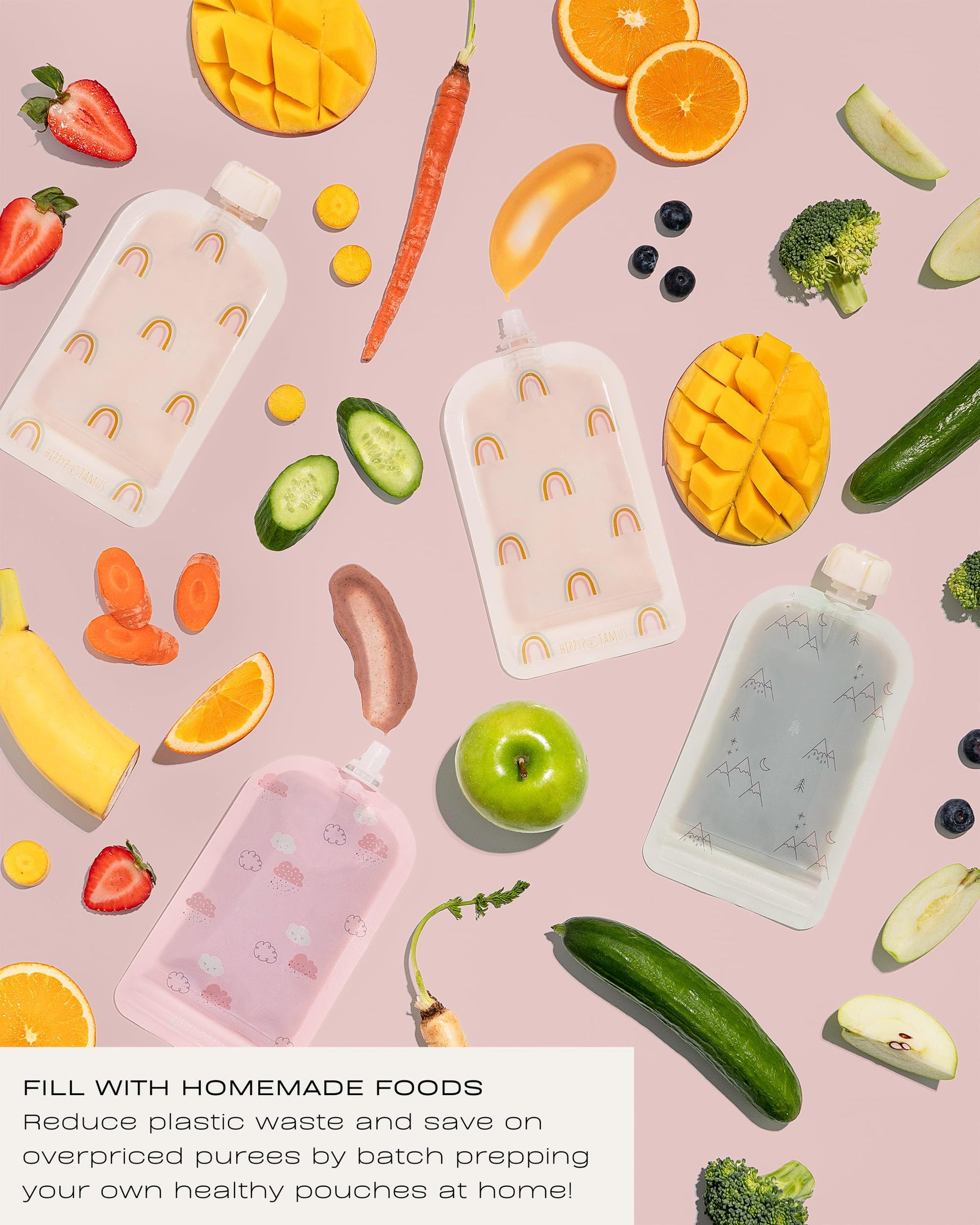 • ✔️ FILL WITH HOMEMADE FOODS: Reduce plastic waste and save on overpriced purees by batch prepping your own healthy pouches at home! Fill them with homemade fruit & veggie purees, applesauce, yogurt, smoothies, chia pudding & more! By filling them with your own creations, you can hand pick your ingredients and avoid processed foods with preservatives and ingredients you can’t pronounce. This way you know exactly what you’re putting into that little belly!