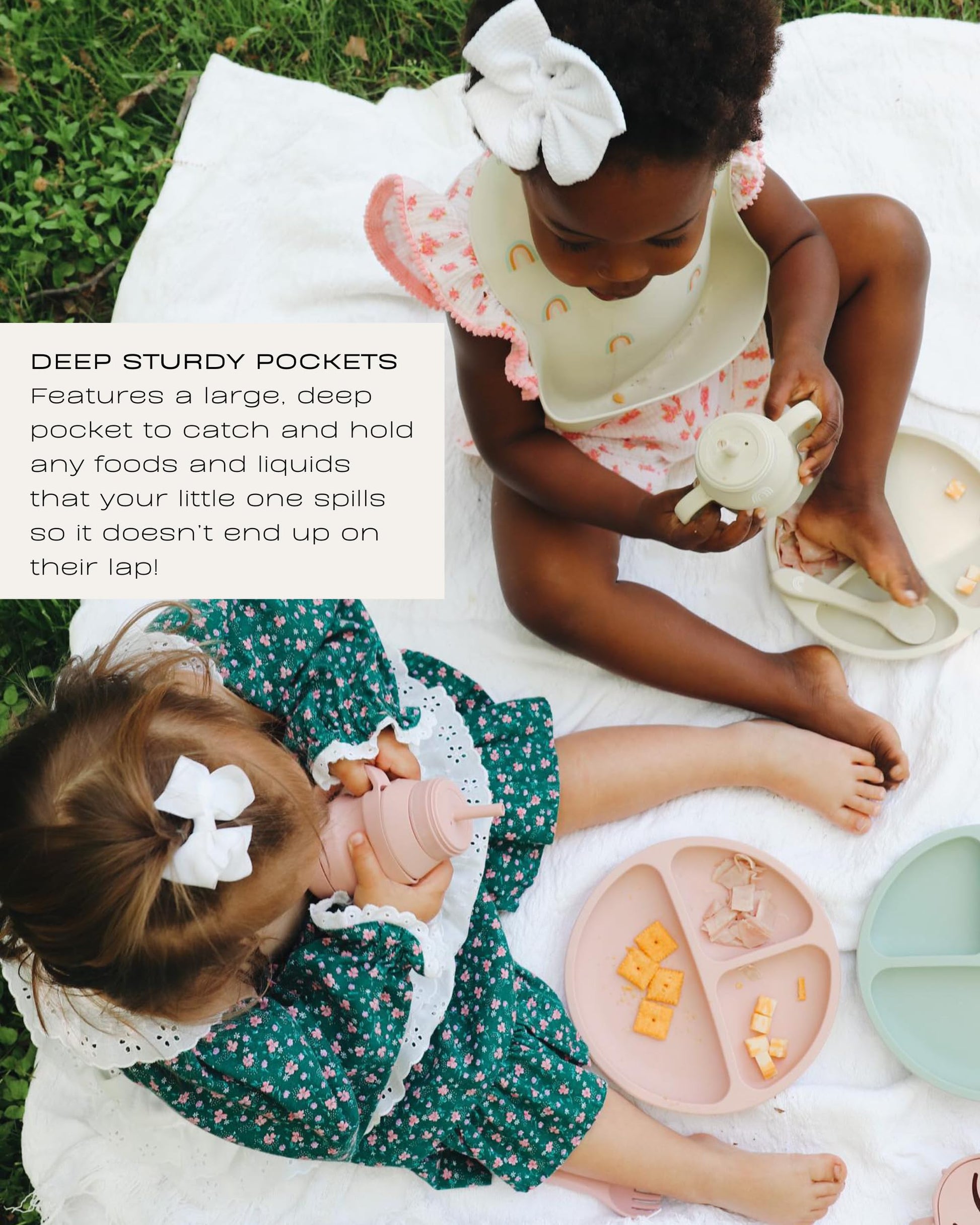 • ✔️ DEEP STURDY POCKETS: Our baby bibs feature a large, deep pocket to catch and hold any foods and liquids that your little one spills so it doesn’t end up on their lap! The sturdy design keeps the contents from spilling out until it’s time to clean up.