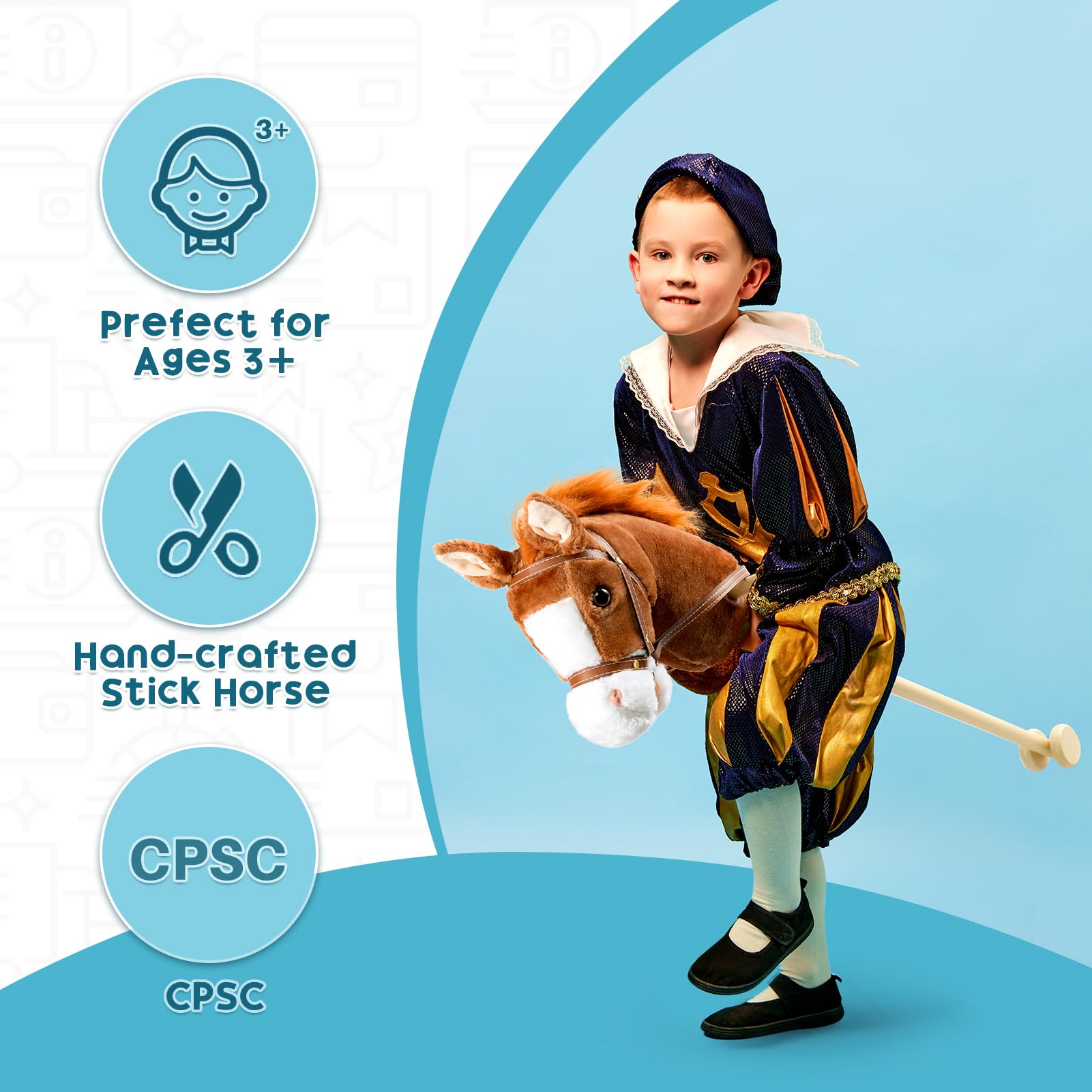 HollyHOME Stick Horse Plush Handcrafted Hobby Horse on a Stick with Wood Wheels Real Pony Neighing and Galloping Sounds for Kids Toddlers Dark Brown 36 Inches(AA Batteries Required)