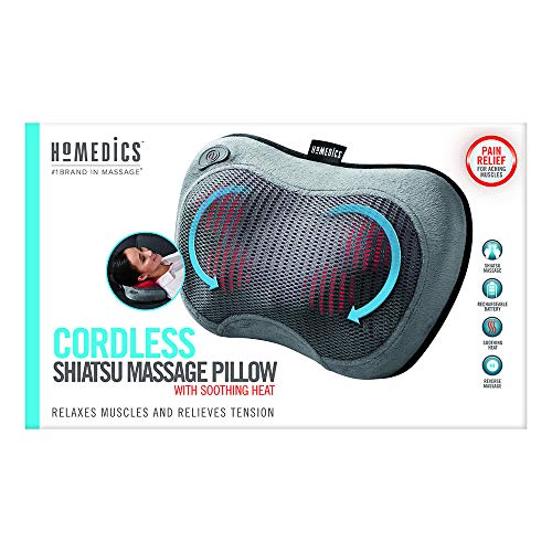 Details: Enjoy the freedom to relax anywhere, anytime. The lightweight, portable Homedics Cordless Shiatsu massage Pillow with Heat is so versatile, it can travel wherever you do. Use it as a pillow for the neck, back, and shoulders, or place it under your legs for a convenient massage for your thighs, calves, and feet. The Shiatsu massage action kneads deep to loosen and comfort tight muscles, while soothing heat adds comfort. This easy to use pillow comes equipped with a reverse function just like the hands of a masseur. This feature works by going in one direction for a bit, Pause, then reverse on its own. Plus, the convenient rechargeable battery and integrated controls provides cordless portability.