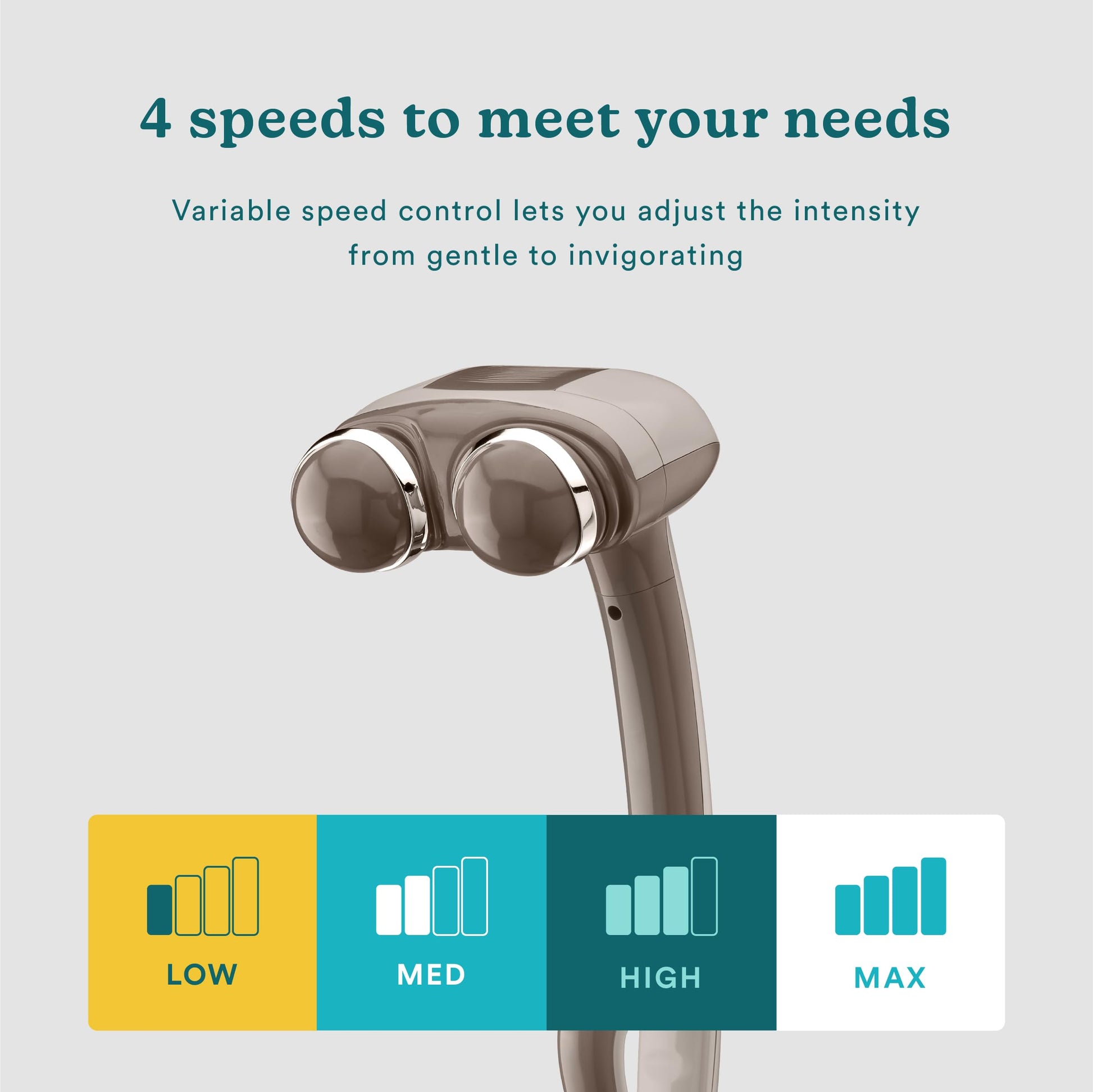 • Dual Pivoting Heads: The dual pivoting massage heads operate at up to 3,100 pulses per minute; choose from 4 speed settings; switch the interchangeable massage attachments for a softer or firmer massage