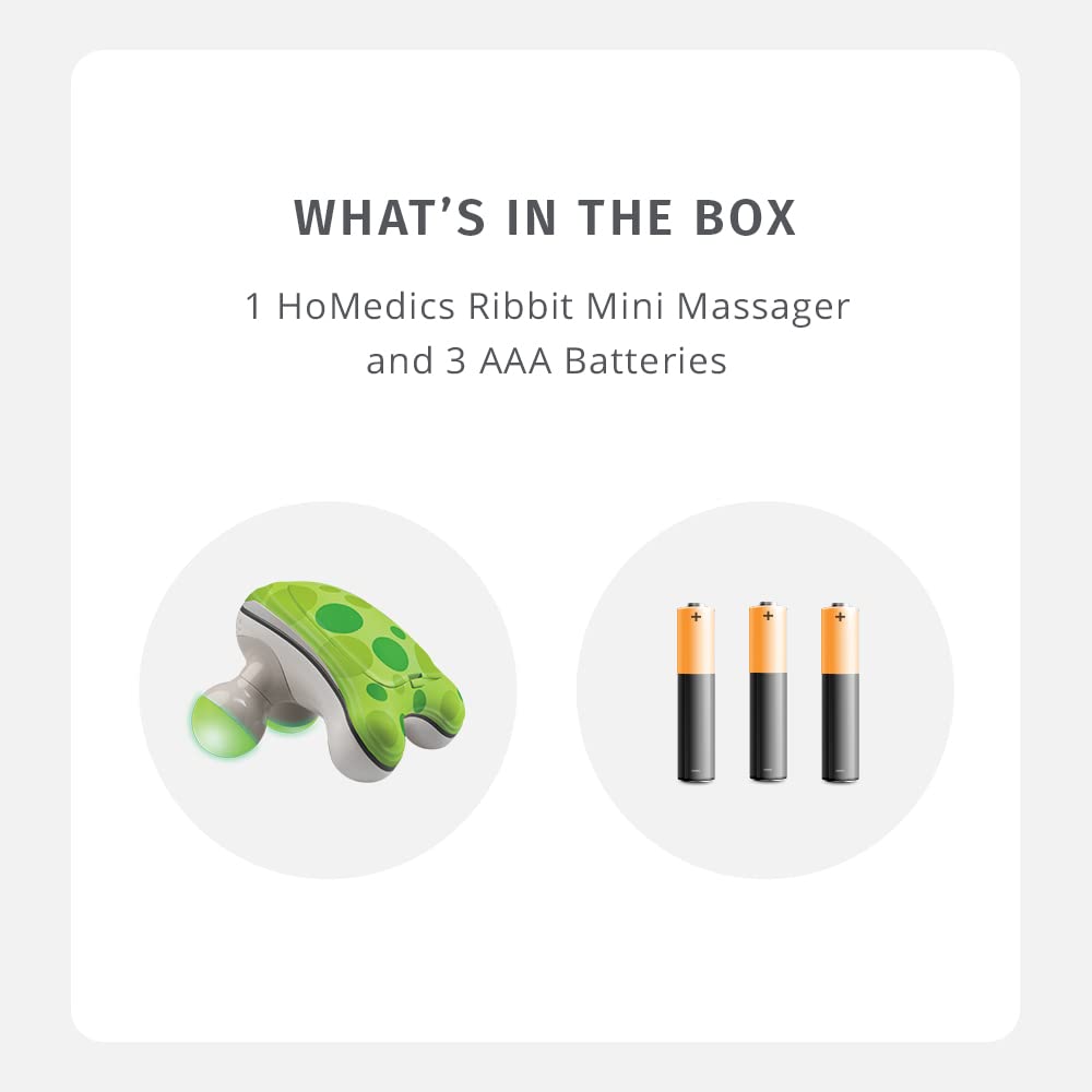 • WHAT’S IN THE BOX – 1 HoMedics Ribbit handheld mini massager and 3 AAA batteries. This completely wireless and cord-free massager is perfect for on the go and comes in 3 different colors to fit your style (blue, pink, or green).