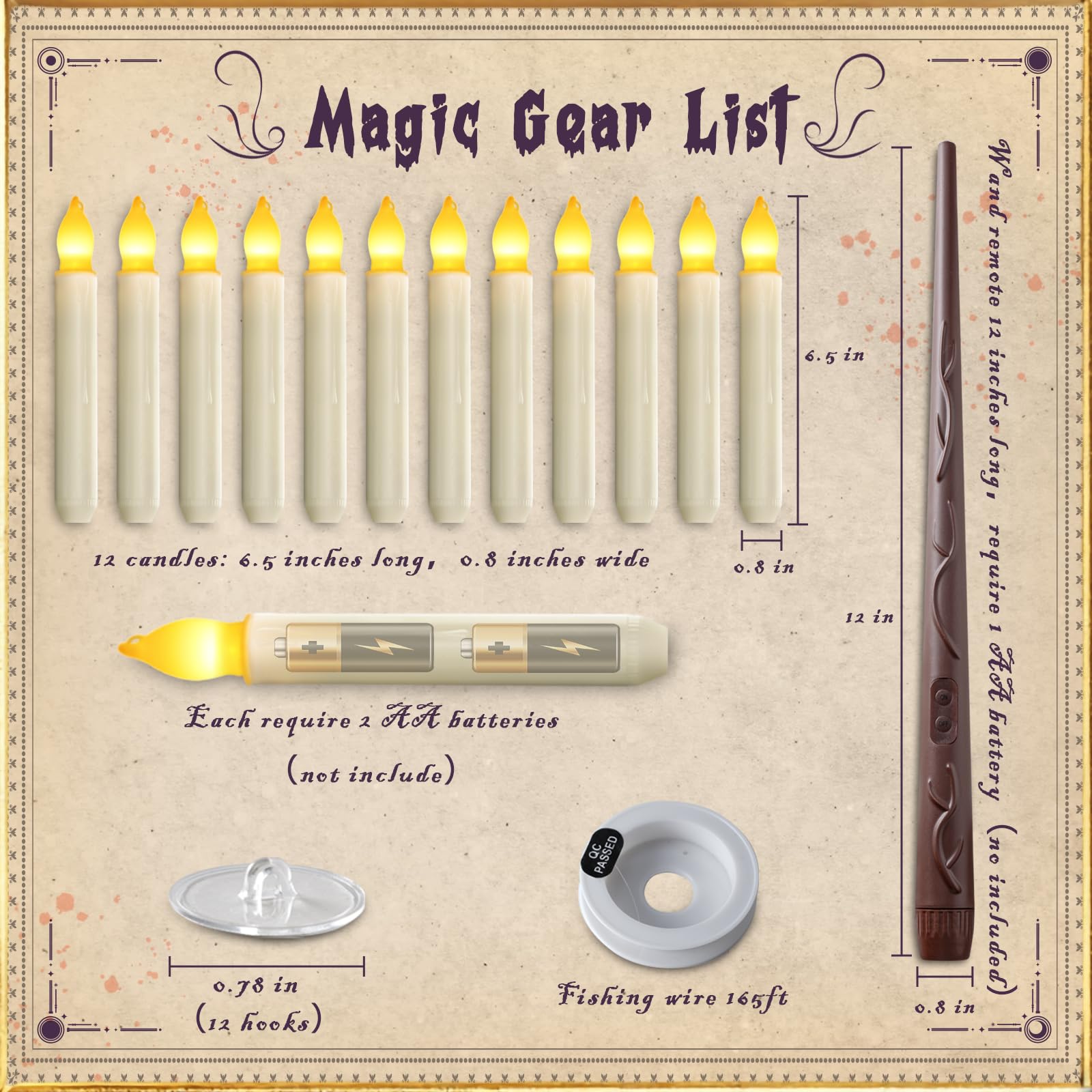 Homemory Floating Candle with Wand Remote, 12 Pcs Magical Candlesticks Witch Decors, Warm Yellow Flameless Taper Candles Battery Operated, LED Window Candle for Halloween Party Decor
