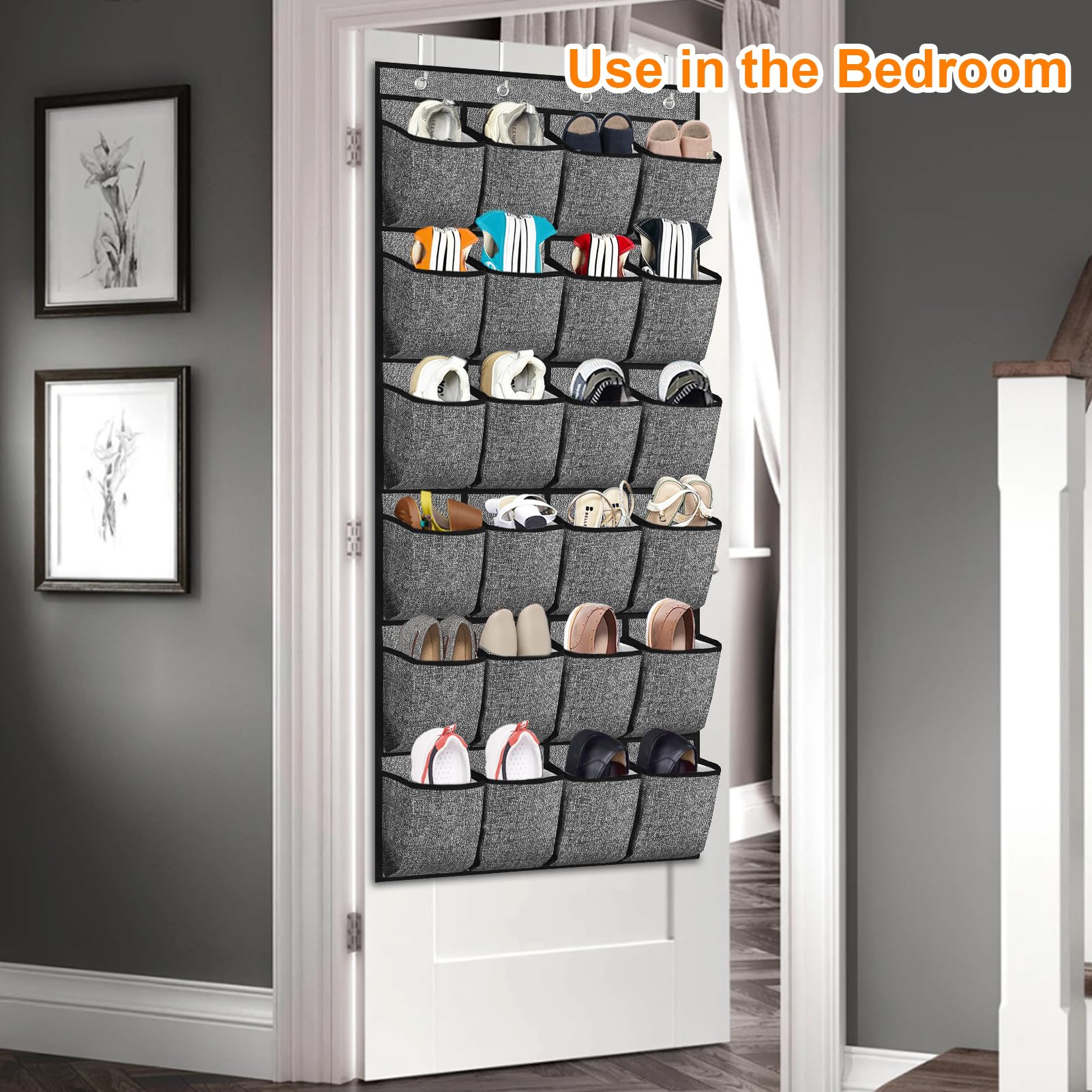 • STURDY THAN NORMAL: This homyfort over the door shoe organizer is made of breathable and durable non-woven fabric and come with 4 sturdy metal hooks, include 24 big and deep pockets. This hanging shoe organizer for closet measures 61.4 x22 inches.