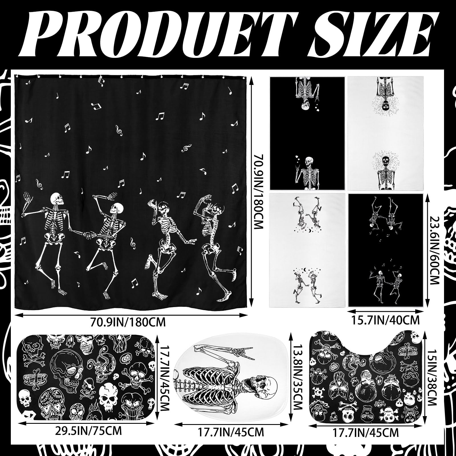 Skeleton Shower Curtain Set: the shower curtain set with rugs and accessories set includes 4 skeleton towels for bathroom, 12 practical hooks, 1 shower curtain, 1 U shaped rug, 1 toilet lid cover, and 1 bath mat; This comprehensive package ensures you have everything you need for a complete and coordinated bathroom and kitchen look