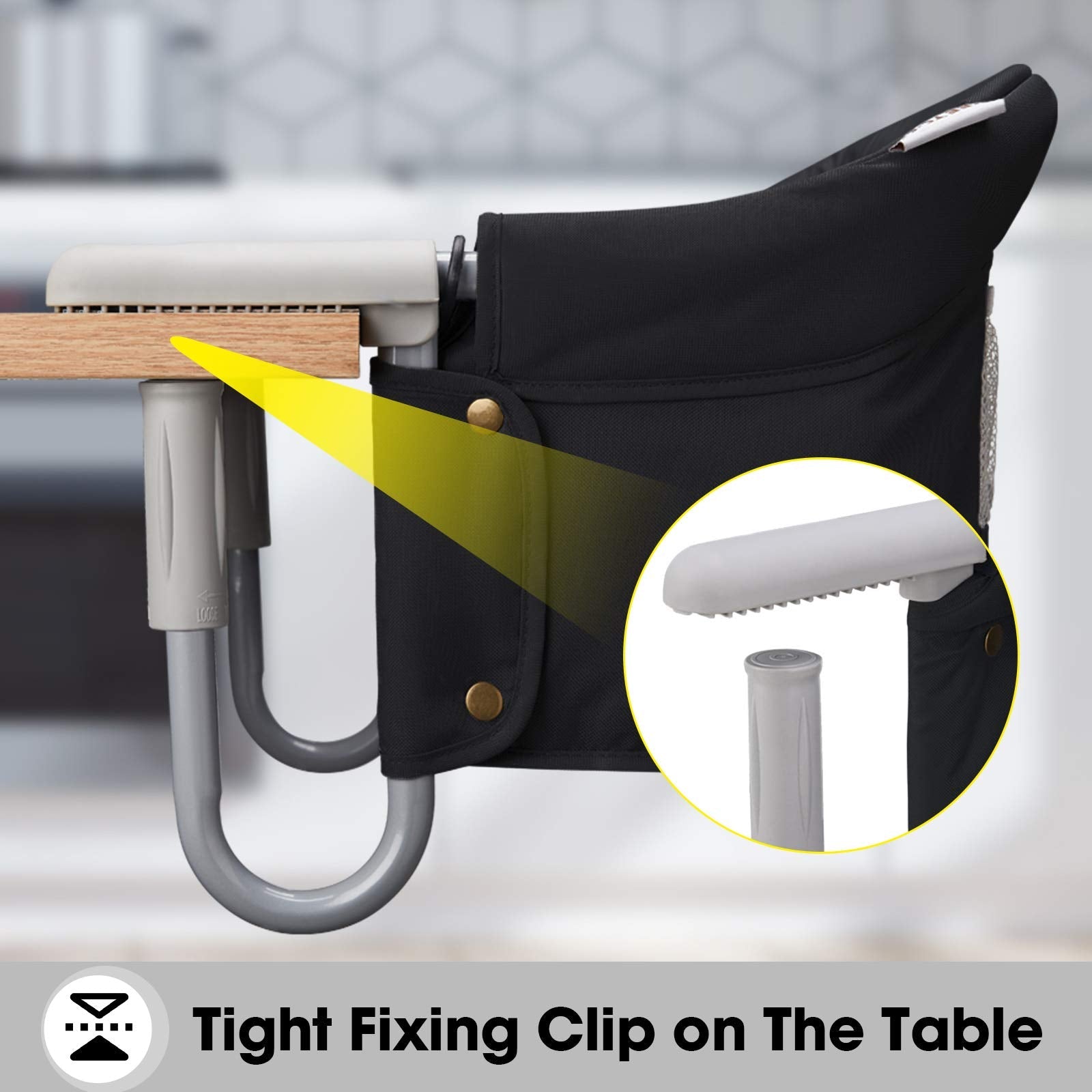 • EASY TO INSTALL: This portable high chair attaches quickly and easily to tabletops. It is compatible with most tabletops and fits tables from 0.8” to 3.4” (20-85mm) thick. Operating this hook on chair is quick and simple