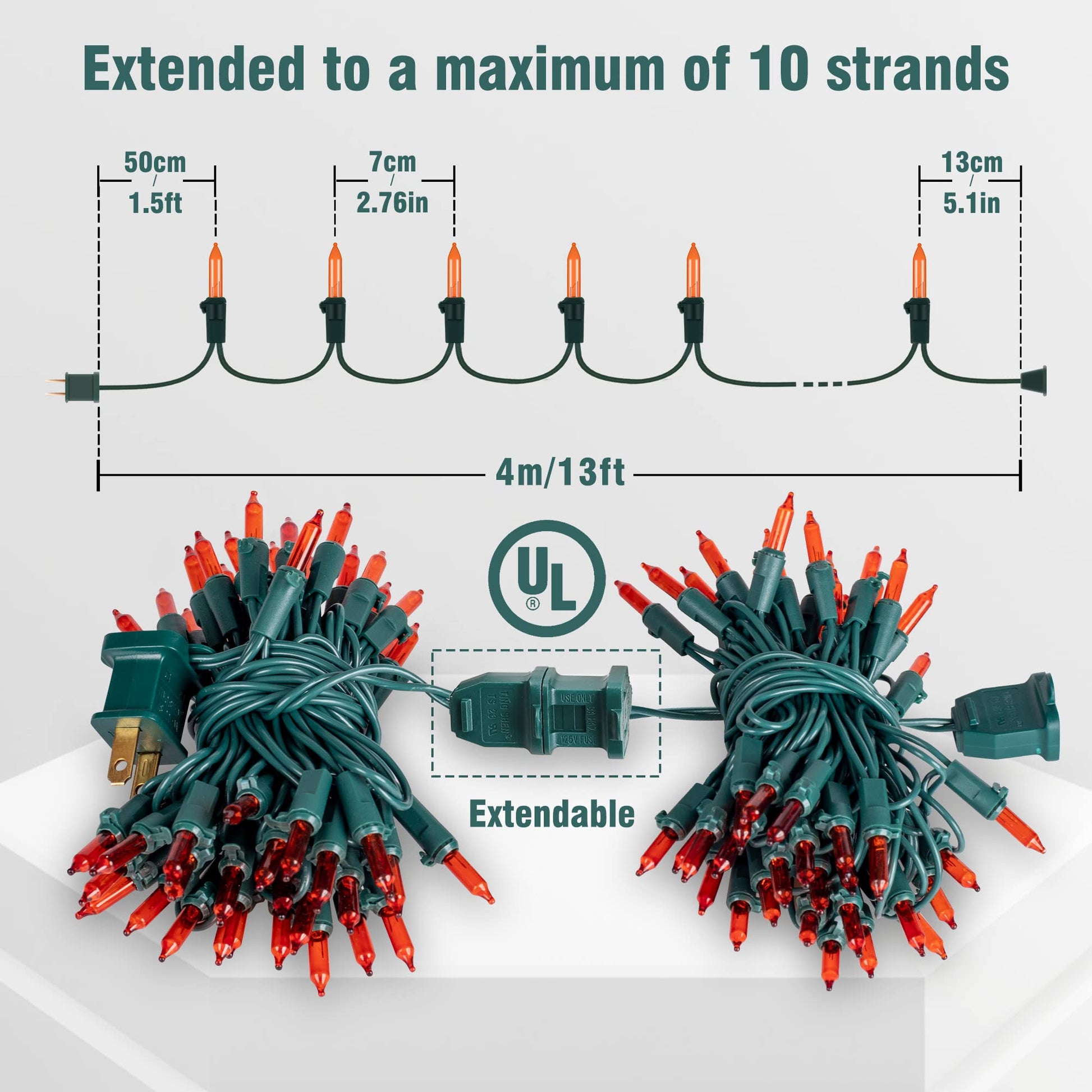 • 🎃Incandescent Orange Mini Lights:Beewin orange old-fashion incandescent Christmas lights, 2PACK 50 count 13ft green wire clear lights string set,each bulb space 2.76in,built-in 3A fuse for safe use.Best choice for Halloween decoration.Extra 4 bulbs and 4 fuses included.