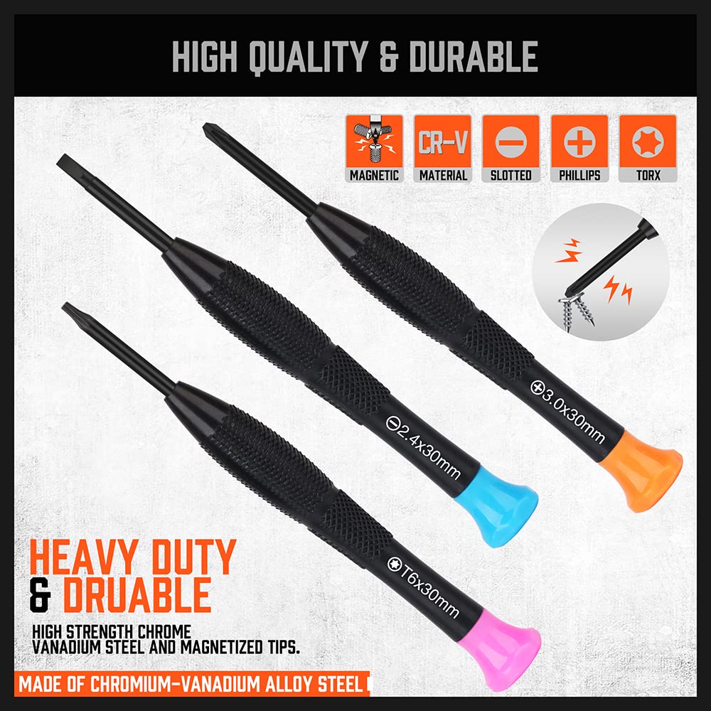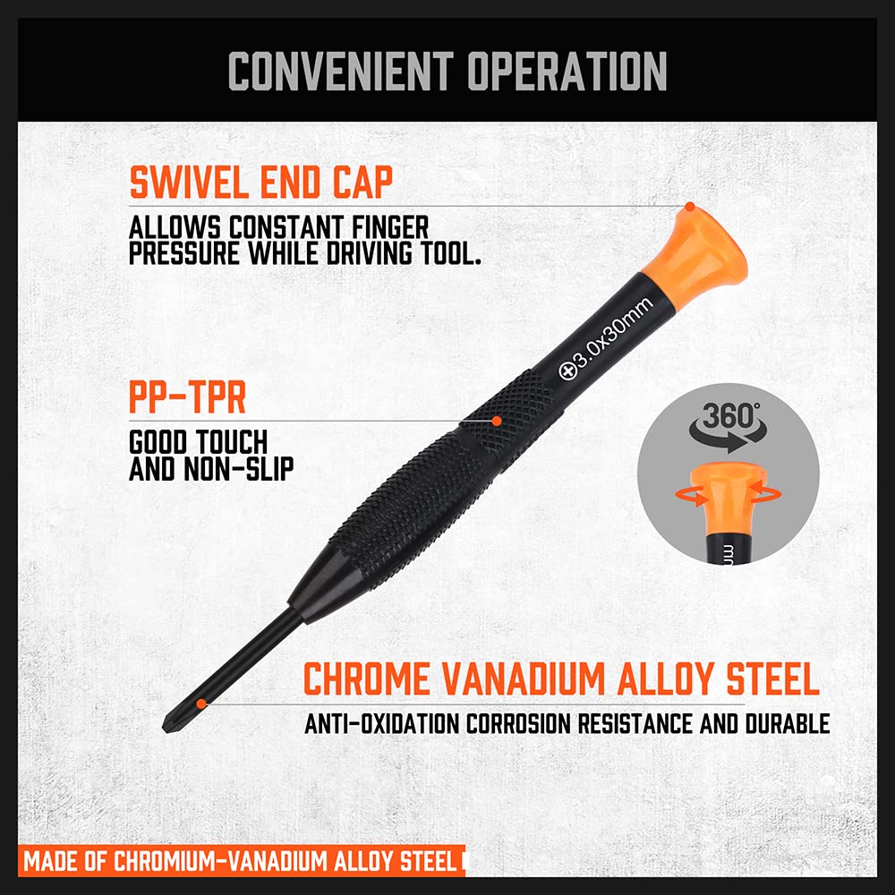 • [High Quality] This mini screwdriver set is made of chrome vanadium alloy steel. The blackening treatment prevent rusting of the screwdrivers. It is also not easy to deform and is durable. The magnetic tip can efficiently attract the screw.