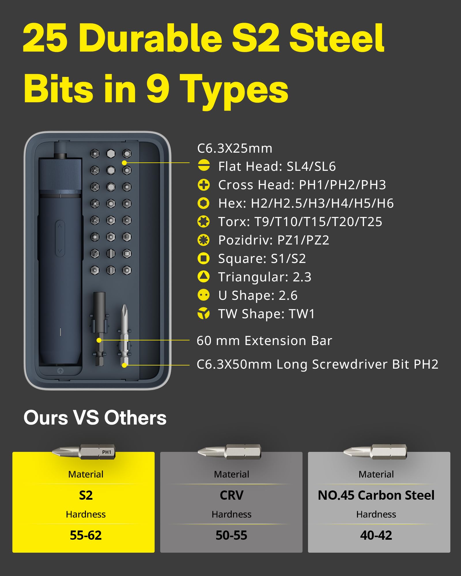 • ULTRA-CONVENIENT - 25 solid S2 steel drill bits with 60HRC strength for long-lasting durability (1x Magnetic Long Bit | 24x Regular Bits). Swap bits in a blink with the magnetic tip and tackle tight spots with the extension rod. And the auto-on, no-shadow circular LED. It's a mini light show in your palm, turning you into a maestro even in the dark. Whether you're assembling furniture, diving into DIY adventures, or tackling electrical repairs, this electric screwdriver set's got your back