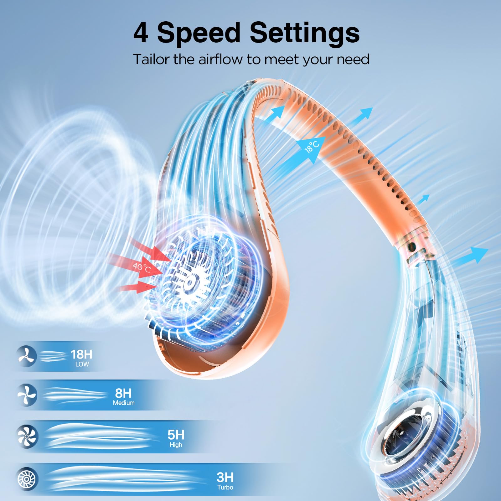 • 【Sleek & Trendy Design, Stylish & Practical】The portable fan for travel features 360-degree surrounding airflow for cooling, a stylish appearance, and a hands-free design that’s easy to wear around your neck, perfect for trips. Personal fans for your neck are essentials for staying cool during outdoor activities like gardening, traveling, hiking, biking, and concerts. It’s also ideal for all rooms use, keeping you comfortable while working, exercising, cooking, or enduring hot environments