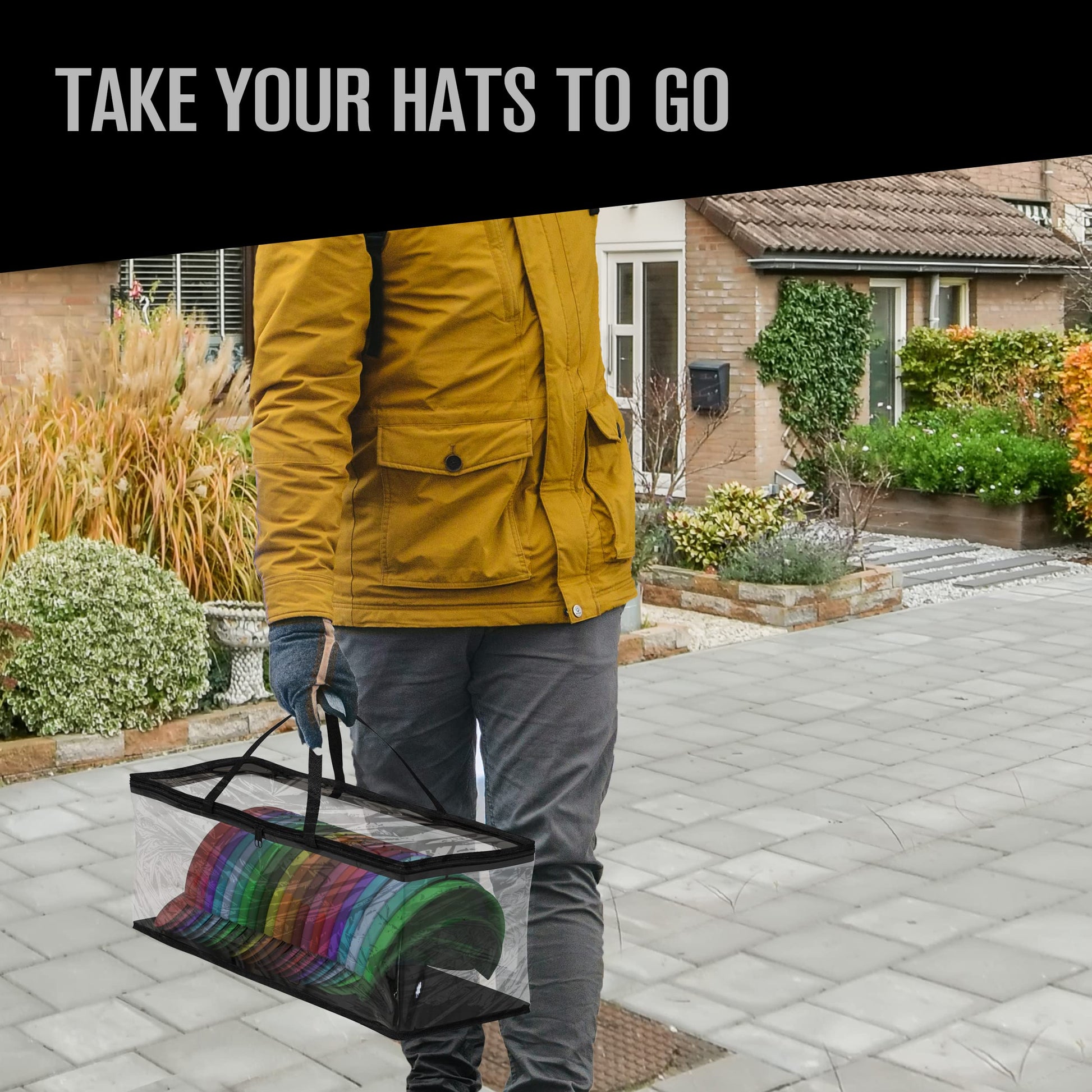 • KEEPS YOUR HATS CLEAN AND IN CLEAR VIEW. Made from durable, transparent plastic material. The wrap-around zippered top gives you quick access to the contents inside for you to add and subtract hats at your choosing. It has two nylon webbed handles for easy transport.