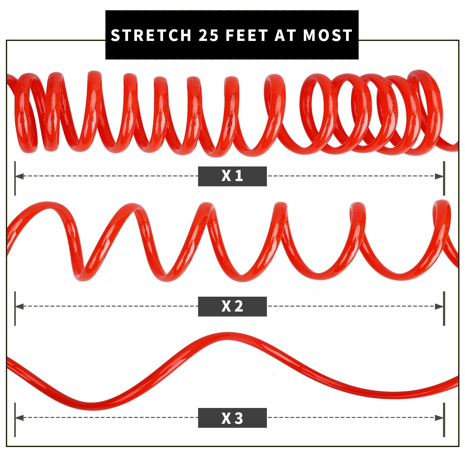 • 25 FEET SELF-COILING: 1/4' ID and 25 ft. Long recoil hose snaps back into shape, preventing kinks and tangles to aiding in wear resistance of hose, no more wasting time coiling your hose for storage. It delivers up to 120 PSI for maximum working pressure.