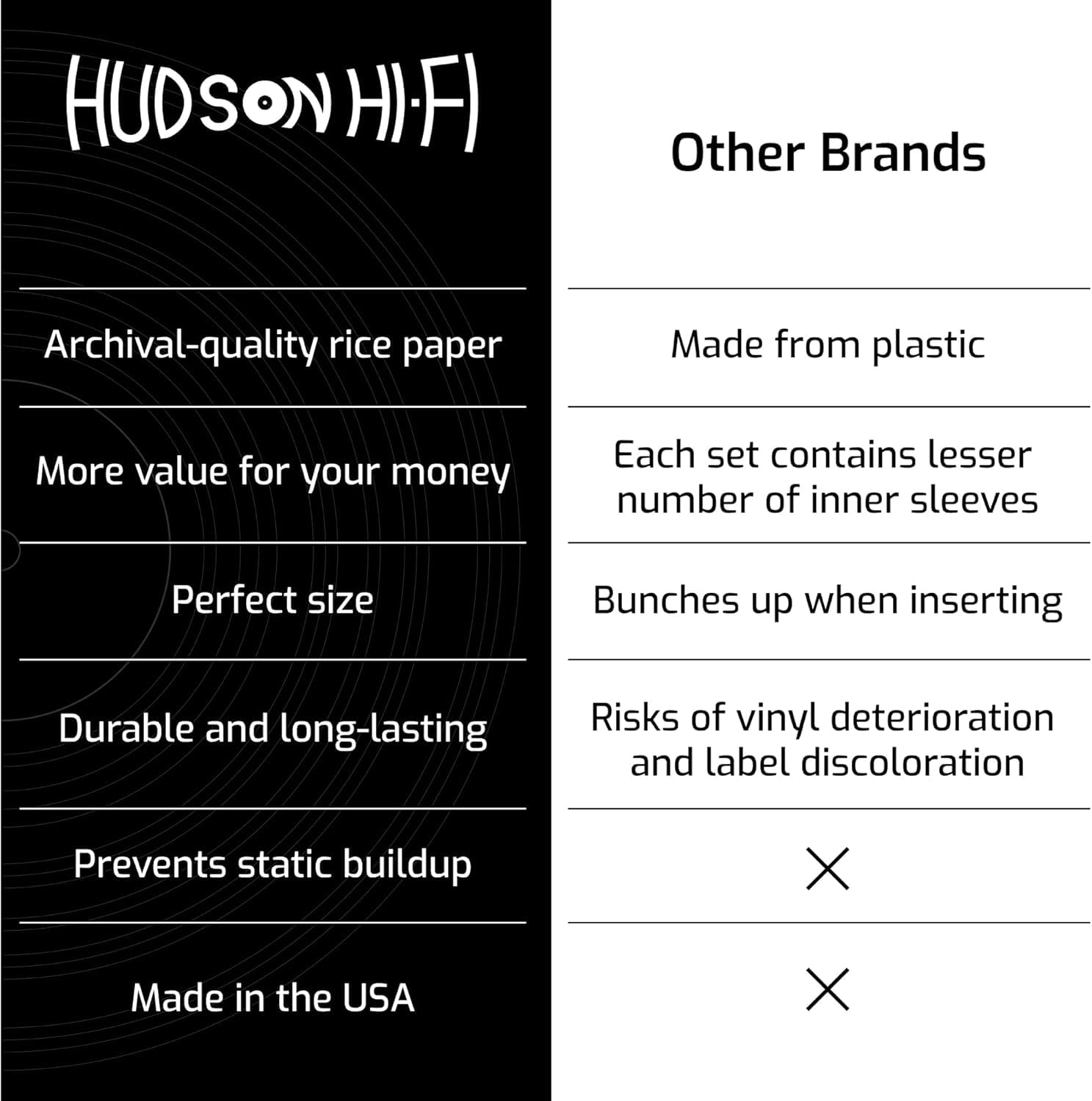 • GET YOUR RECORD PROTECTOR SLEEVES TODAY 100% RISK-FREE! If you are not 100% thrilled with your Hudson Hi-Fi premium inner sleeves, we promise to offer you a full and prompt refund! No questions asked!