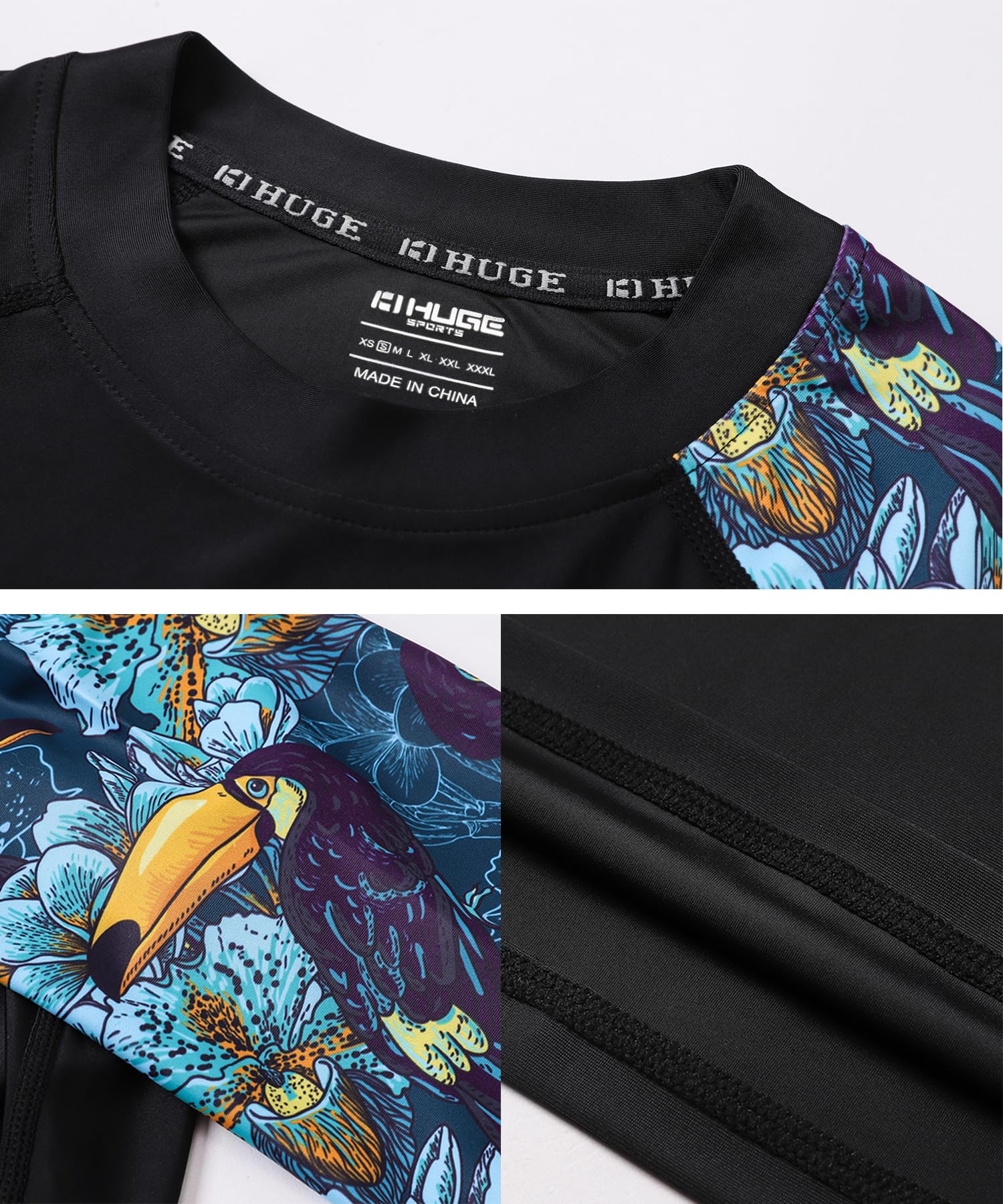 HUGE SPORTS Men's Splice UV Sun Protection UPF 50+ Skins Rash Guard Short Sleeves(HeyToucan, L)