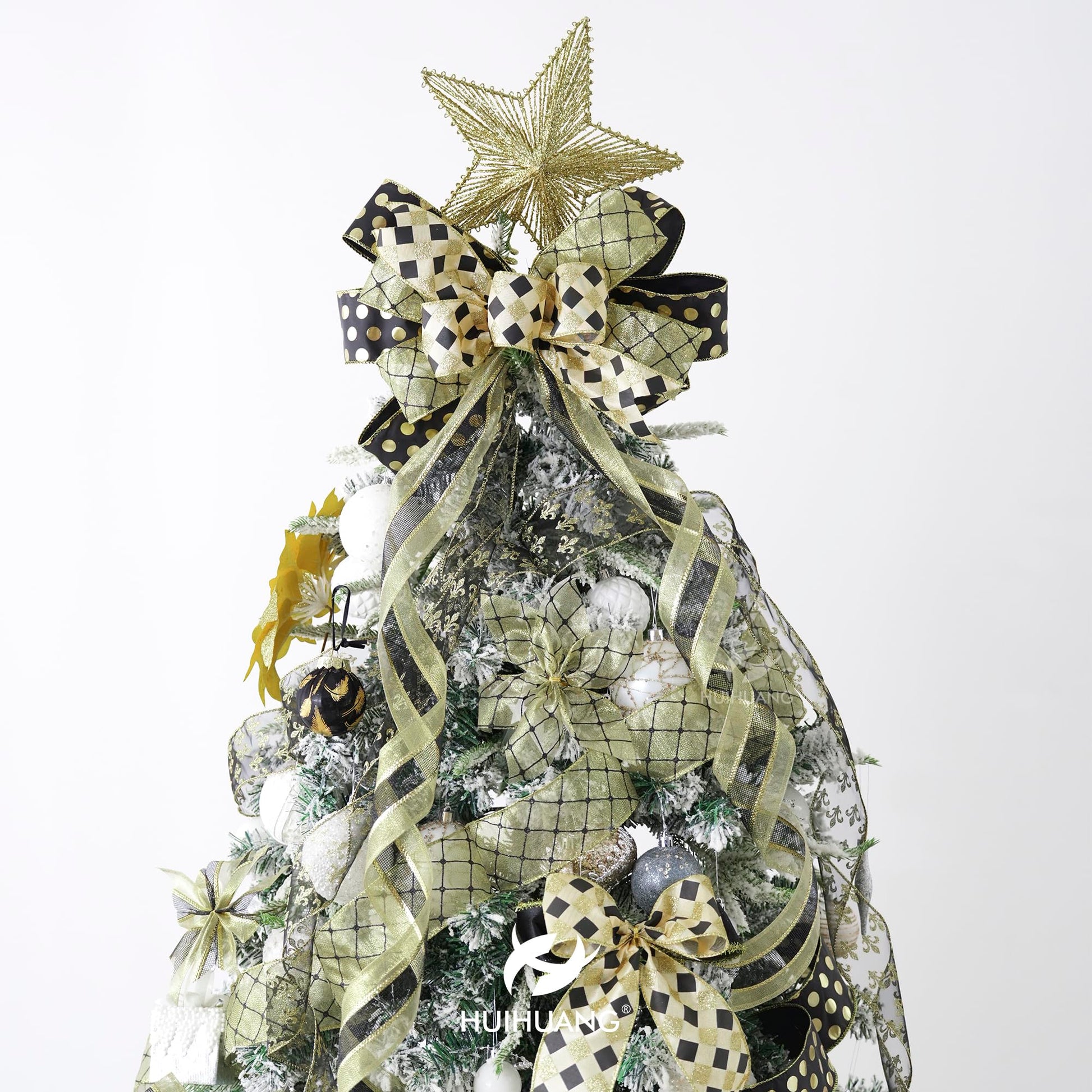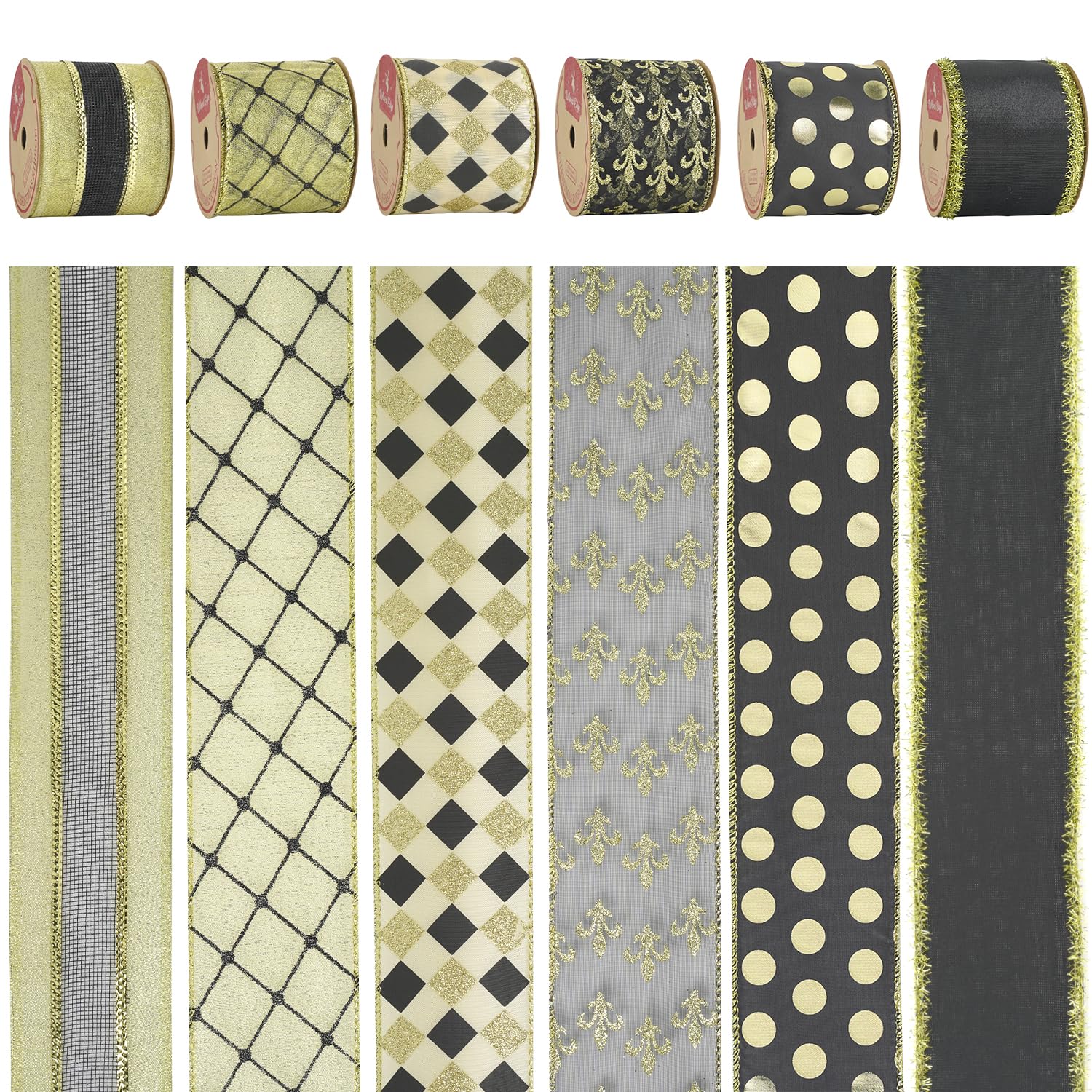 HUIHUANG Black Wired Ribbon for Christmas Tree Black and Gold Christmas Ribbons for Tree Decorations, Bows, Wreaths, Garland, Gift Wrapping, Crafts, Home Decor (2-1/2" x 6 Rolls, 36 Yds Total)