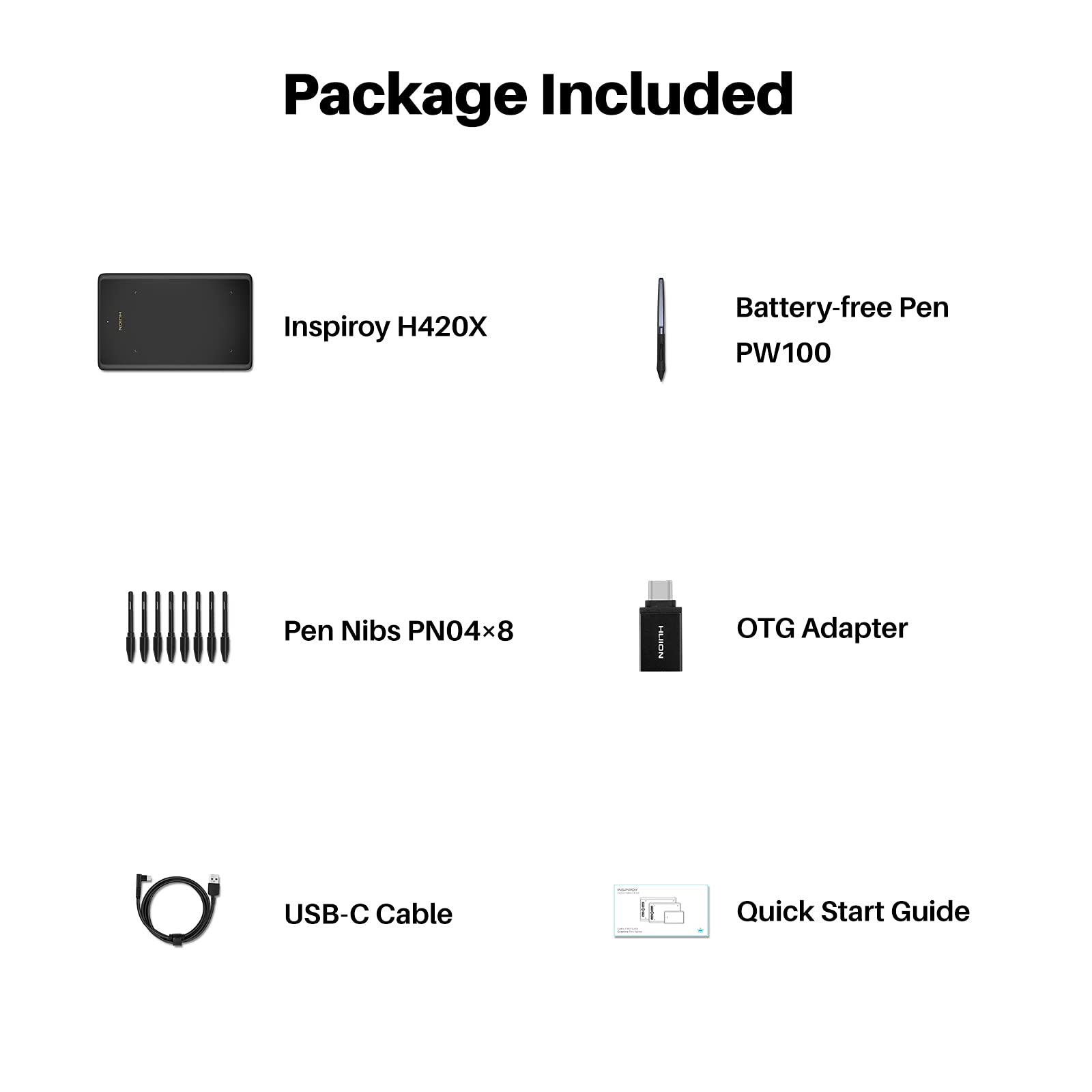 • H420X huion drawing tablet is compatible with Windows 7 or later, Mac OS 10.12 or later, and Android 6.0 or later. Huion H420X drawing pad has good compatibility with most drawing software including Adobe Photoshop, Paint tool sai, Corel Painter, Illustrator, Sketchbook, Manga Studio, Clip Studio Paint, Fireworks, Comic Studio, SAI, Krista, Infinite Stratos, Pixologic ZBrush and other major graphics applications, and more. H420X is NOT compatible with iOS.
