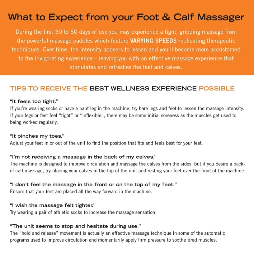 PROFESSIONAL GRADE - The ergonomic design provides a comprehensive and comfortable foot and calf massage, using compression to deliver spa-grade stress relief. The base tilt is easily adjustable for perfect angle compatibility with a favorite sofa or chair.