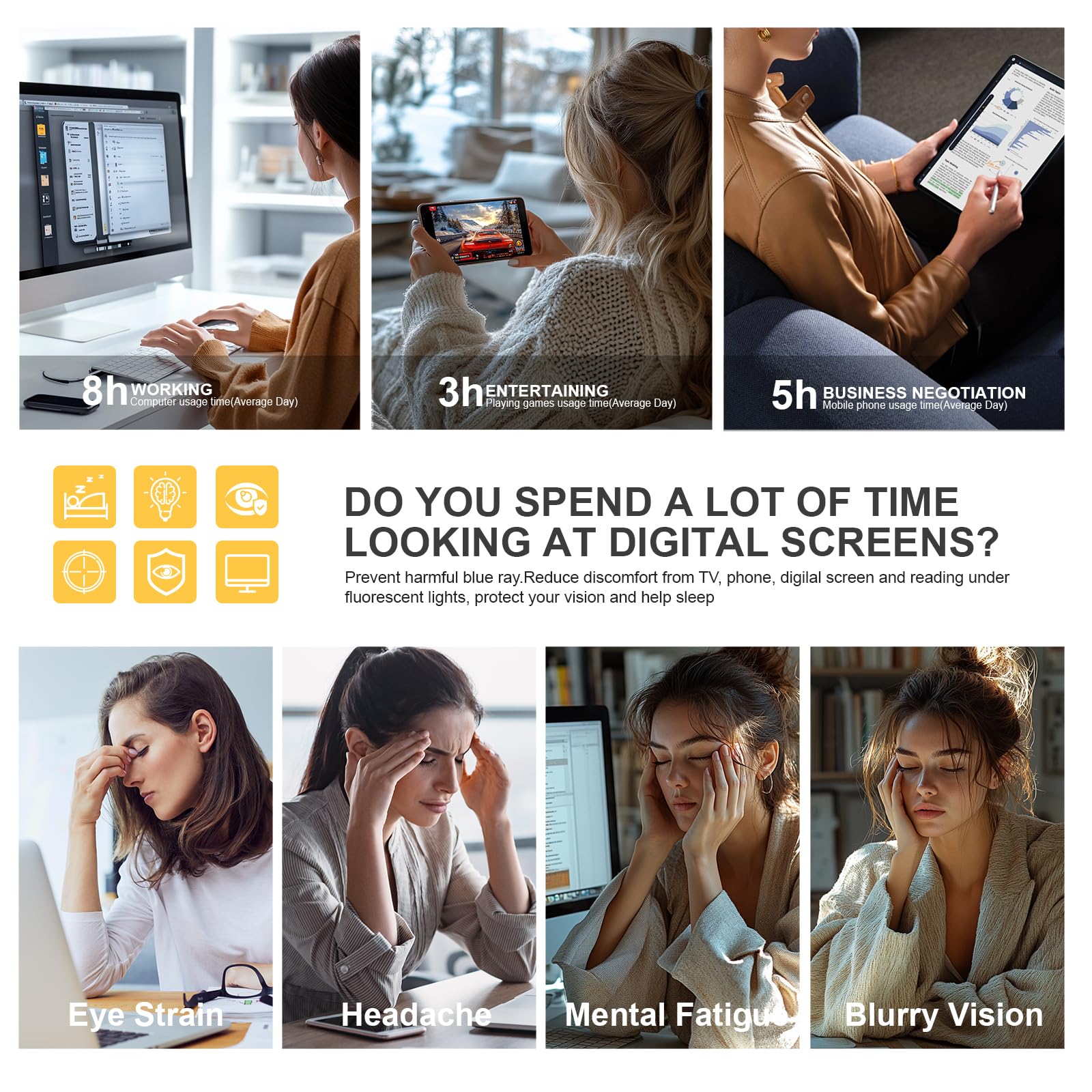• Filter Blue light Glasses for Women/Men: Reduce Eyestrain-Enjoy your digital time, No worry about eye fatigue, blurred vision and headache. Because the glasses block the most harmful blue light from computer, phone and tv