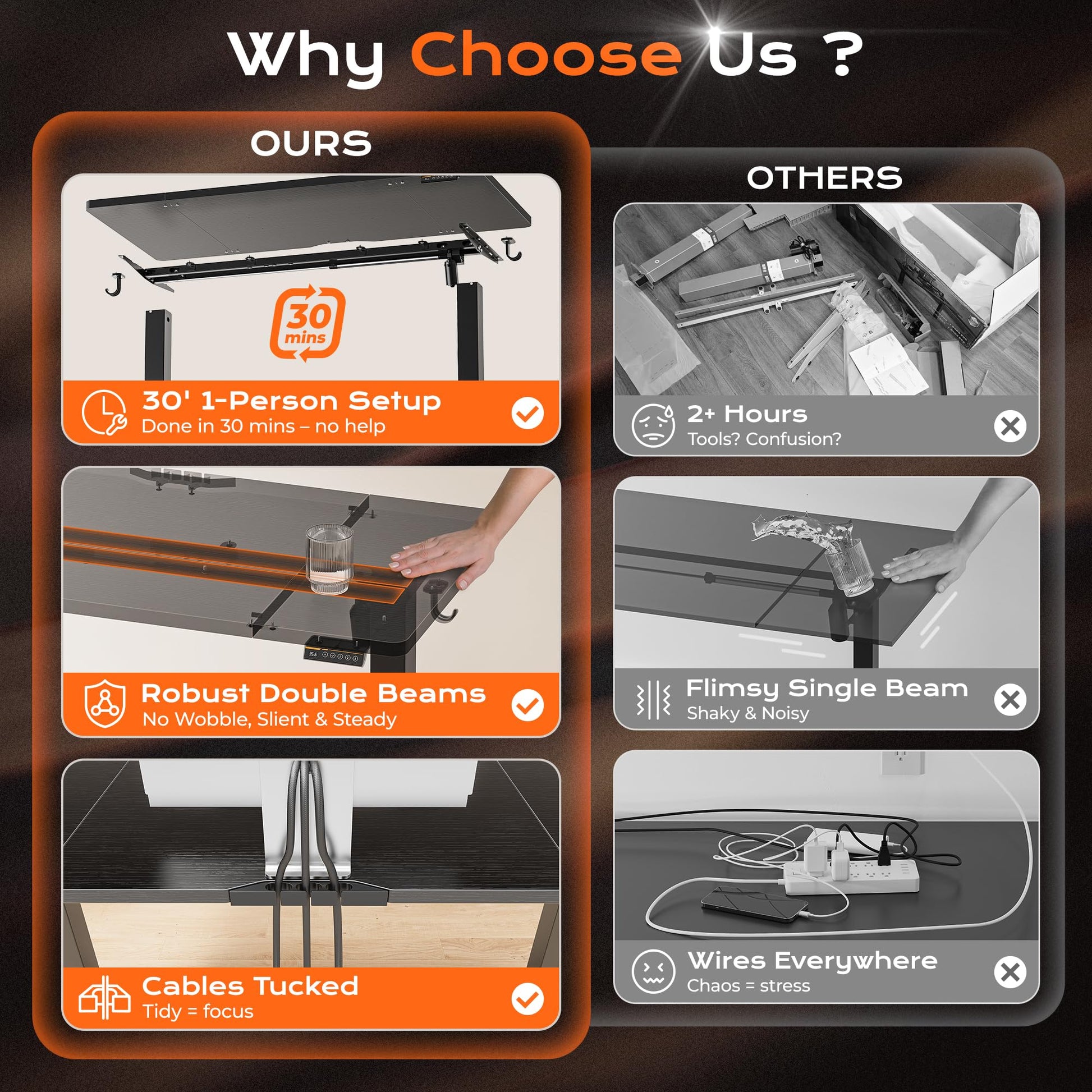 • 【Whisper-Quiet Operation】Powered by a robust yet quiet motor (operating at less than 45 DB), the wide deep desk brings smooth height adjustments without disturbing your household or office environment. This standup desk for home office is ideal for keeping focus and slient