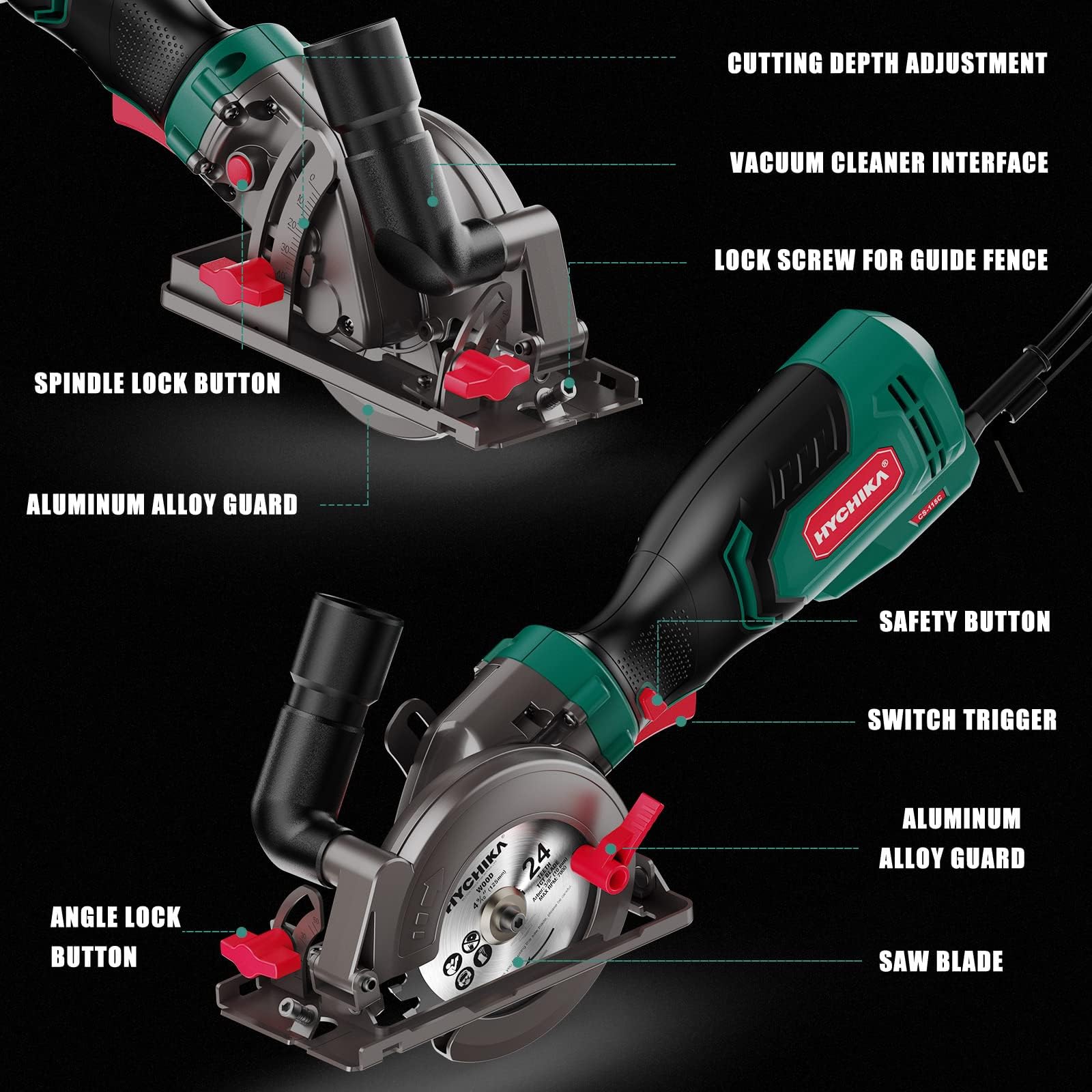 • 0-45°Bevel Cutting & Depth Guide: The HYCHIKA compact circular saw allows you to change your cutting angle freely from 0° to 45°(50° max). Equipped with adjustable cutting depth, the max cutting depth of 1-7/8' at 90°and 1-1/4' at 45° can meet your versatile needs. Easy-set depth gauge lever for adjustable cutting depth from 0-32mm(1’’)