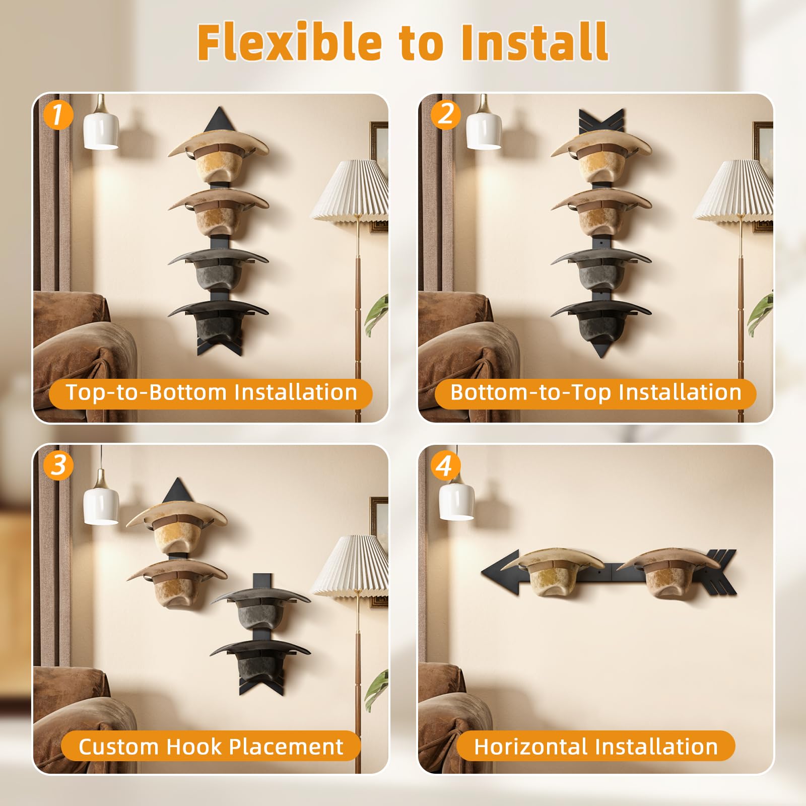 • Save Storage Space: Design for 4 cowboy hat, or 3 cowboy hat and 10 baseball caps. Install this storage and organization system at your bedroom, living room, closet, garage and more, you don't need to left hats anywhere and get the room messy, compact design store and display your cowboy or cowgirl hat in neatly, won't take up much space on you wall, also can be a part of vintage home decor