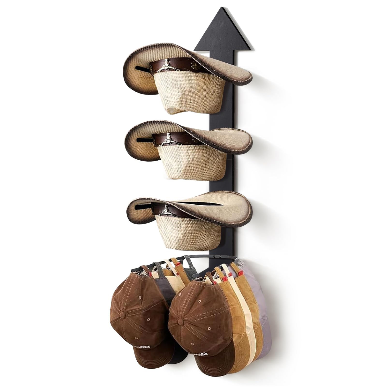 HYDERMUS Hat Organizer for 10 Baseball Caps and 3 Cowboy Hat Cowboy Hat Rack for Wall with Solid Wood Arrow Hat Storage Cowgirl Hat Hanger Closet Storage and Organizer Black