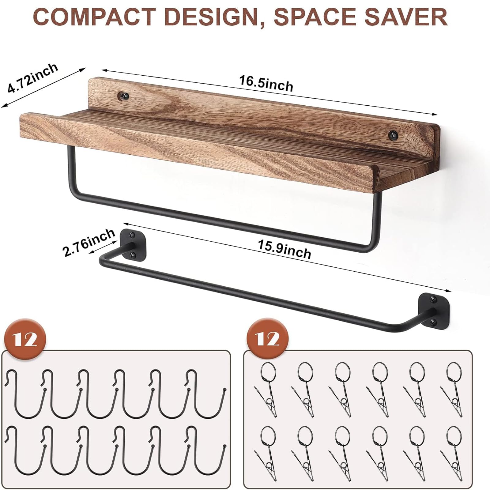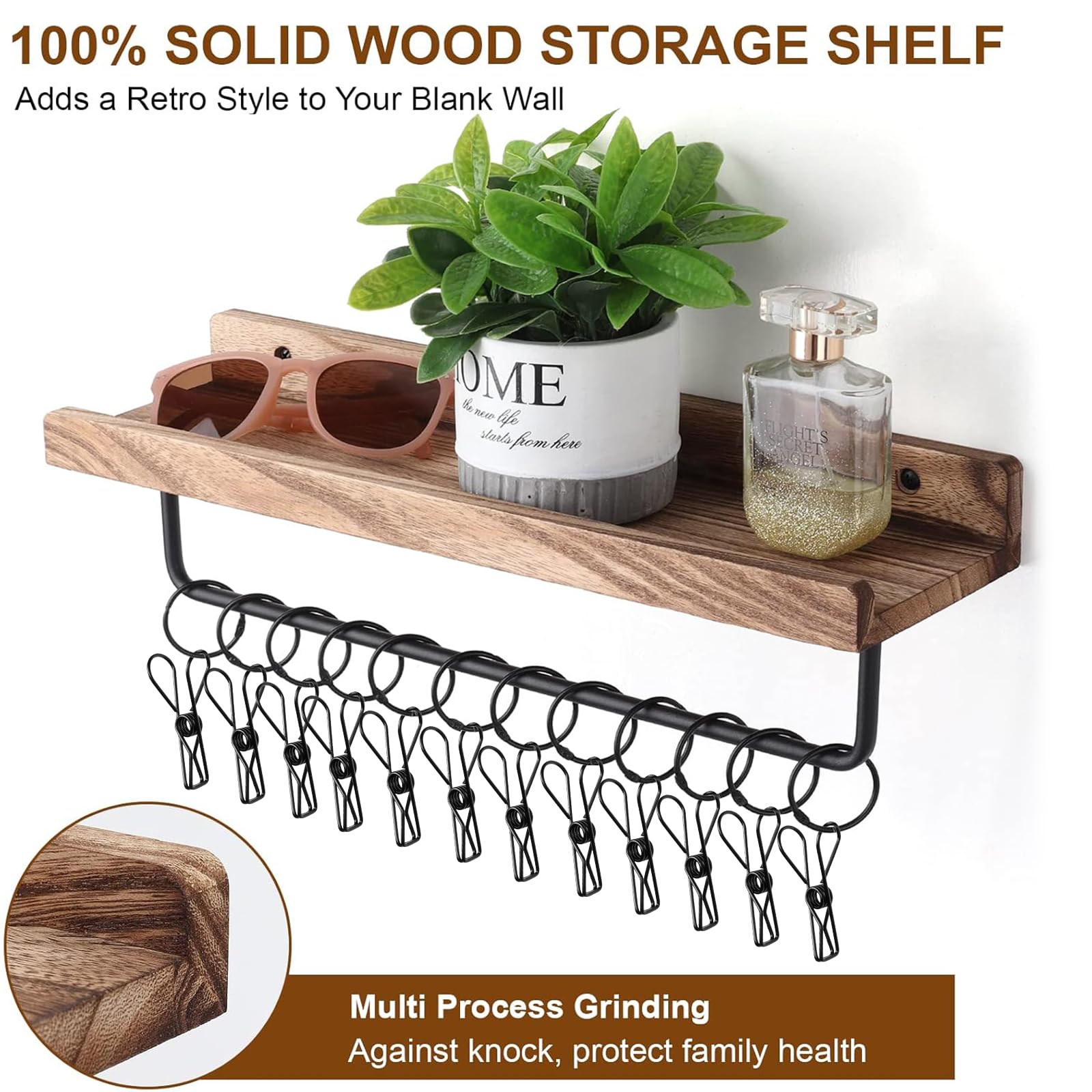 • A Rustic Wood Shelf for Display: Comes with a solid wood shelf with hand-made carbonized black finish, which features rustic style and clear wood texture, the shelf measured about 16.5 x 4.8 inch with edge to prevent falling off. Install them on wall to display your collectibles, pictures frames, sunglasses, plants, decor accents and more, which will goes well with your home.