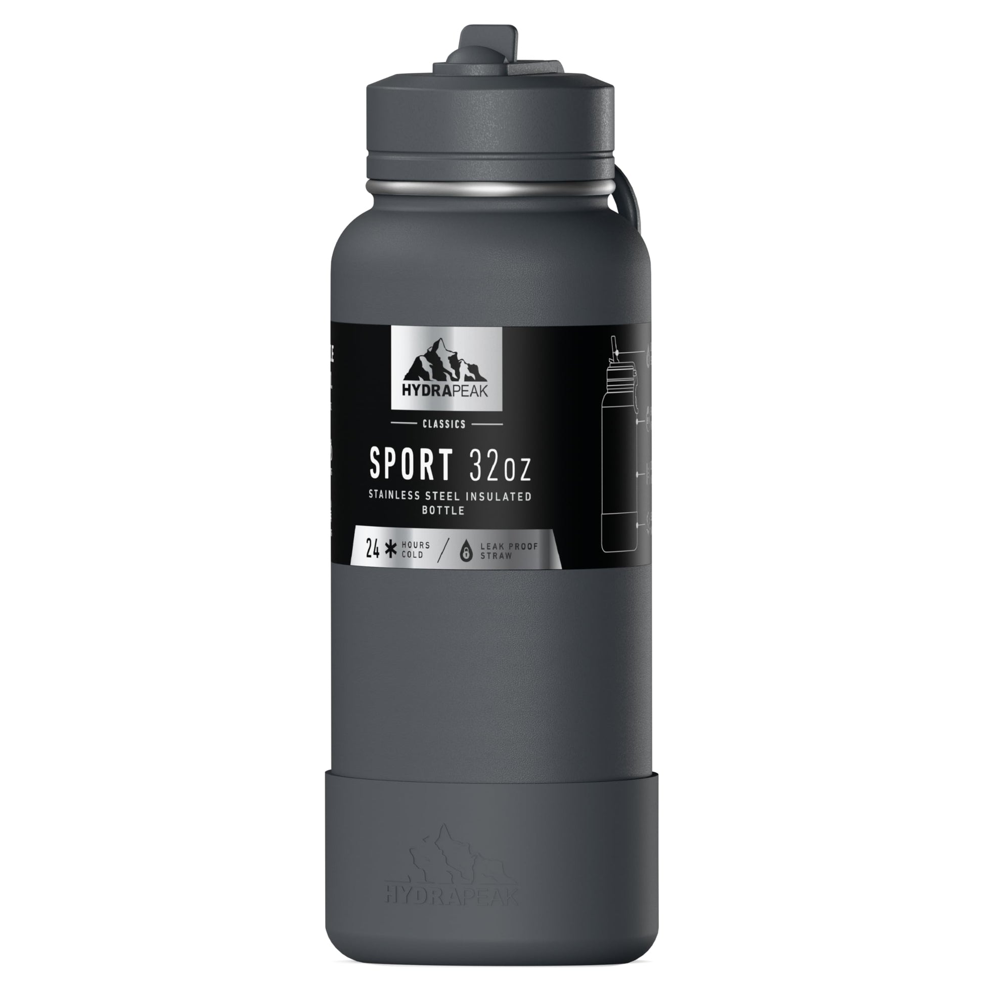 Hydrapeak 32oz Sport Insulated Water Bottle with Straw or Chug Lid, Leak & Spill Proof, Keeps Drinks Cold for 24 Hours, Hot for 12 Hours (Grey Matter)