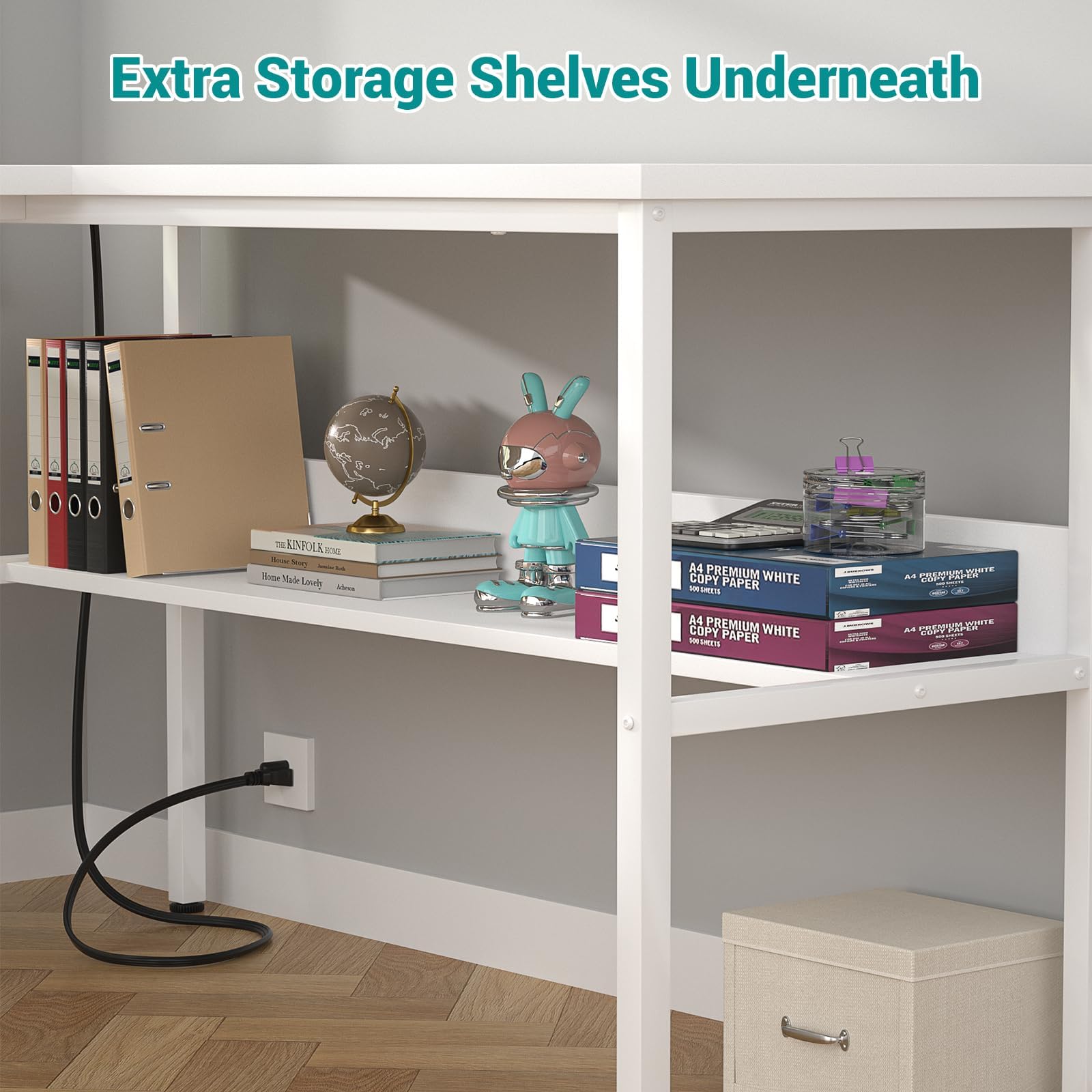 Hyomdeck Reversible L Shaped Gaming Desk with Power Outlets and USB Charging Ports, Sturdy Computer Desks with Storage Shelf, Modern Corner Desk Home Office Table, Easy to Assemble, White