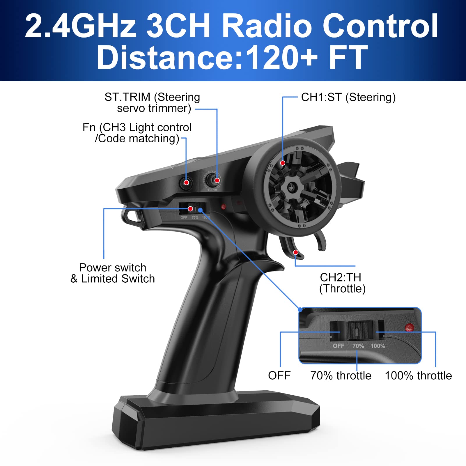 • Transmitter: 2.4GHz 3-Channel Radio with light bar control, 70% throttle limited switch great for beginners