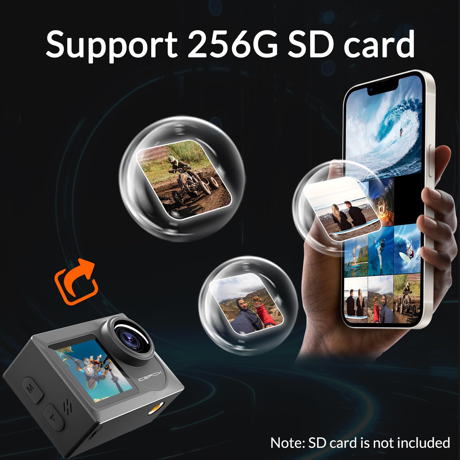 icefox i8 Action Camera with 4K 60FPS 20MP, 5X Zoom, Underwater Waterproof Camera with Optimized EIS, Video & Photo Editing by Snap Pro App, WiFi Remote Control for Diving, Cycling and Vlogging