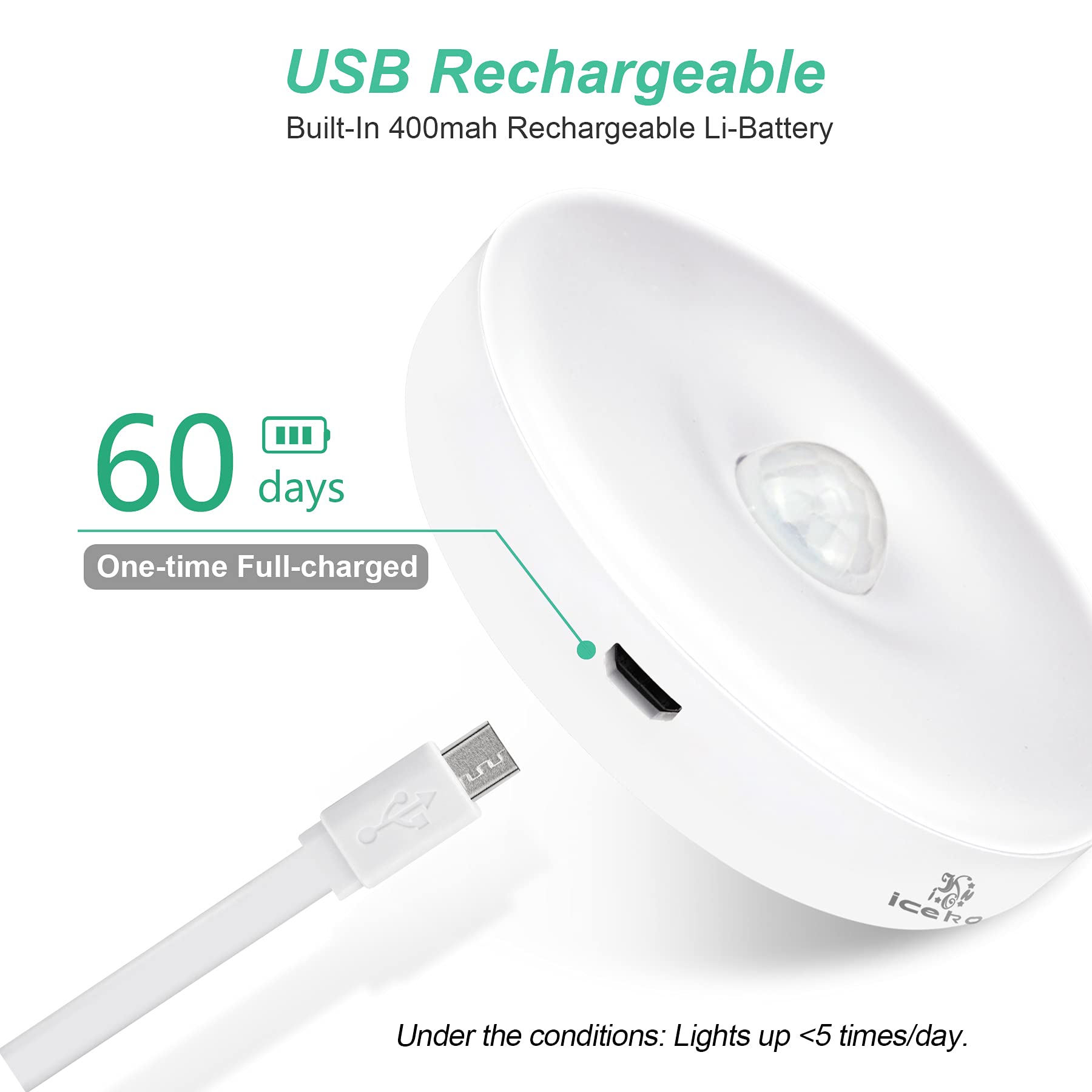 ICEKO Night Light with Motion Sensor, Lamp with Motion Sensor Indoor, USB Battery Rechargeable, 6 LED Motion Sensor for Cabinet, Hallway, Bedroom, Children's Room (White, 3 Pieces)