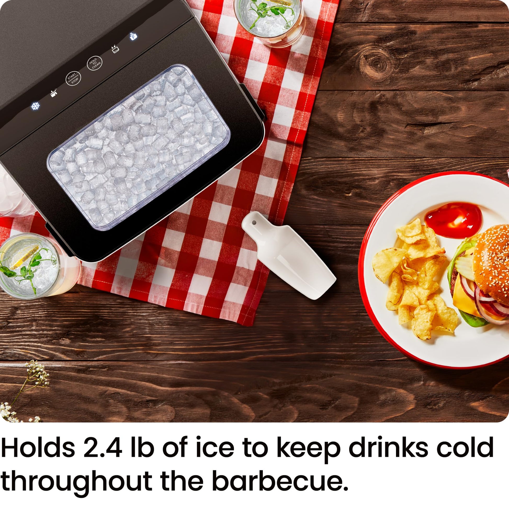 • COUNTERTOP FRIENDLY: This personal ice maker is small enough to fit on your countertop but large enough to hold 2.4lbs of ice at once. A removable basket and ice cube scoop are included for easy serving.