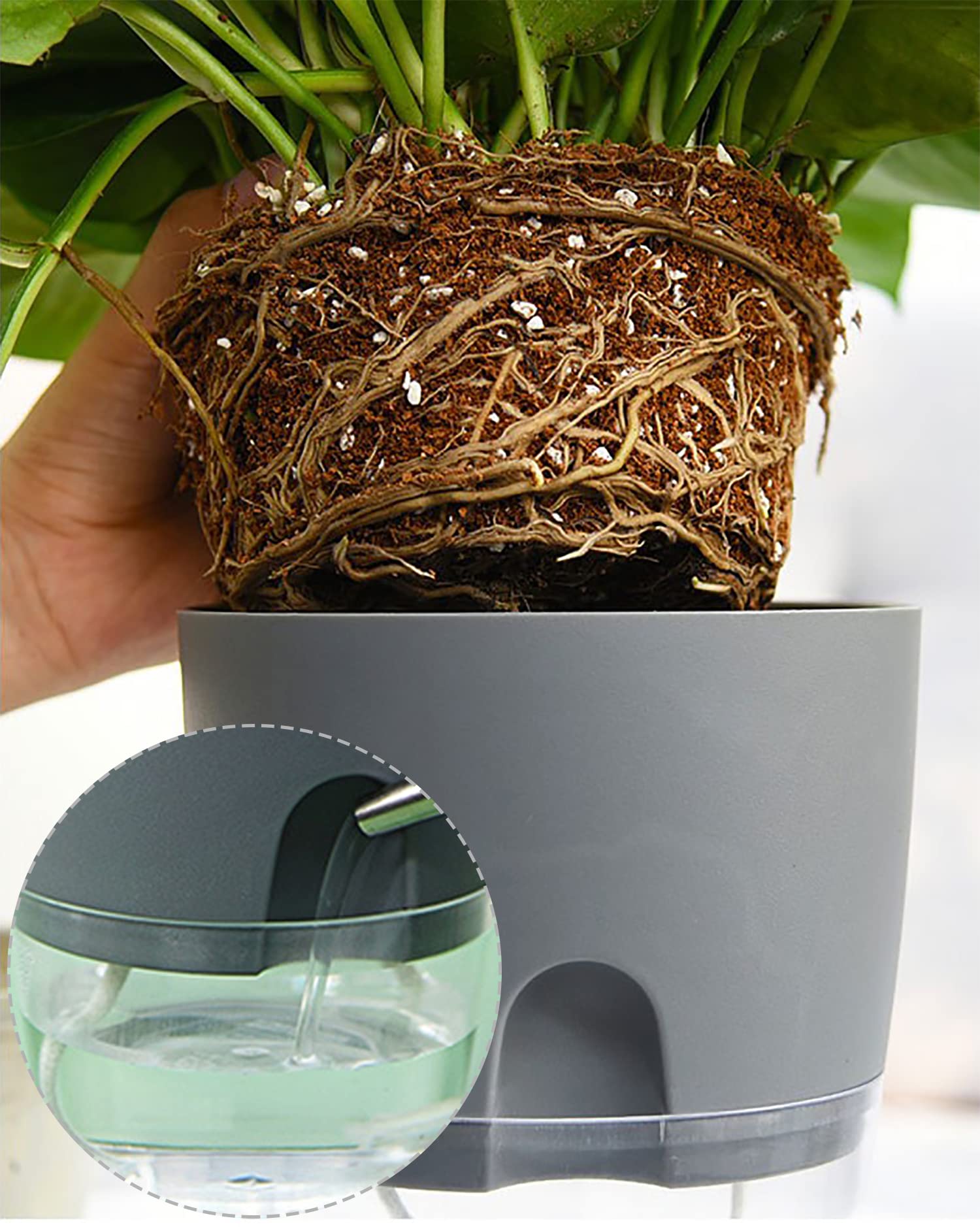 Automatic Watering System The self watering flower pot for windowsill is designed with double layers. The kitchen herb pot can store excess water and keep it clean. The watering rope absorbs water and stores it to ensure healthy growth of plants. The water is separated from the interior and only absorbed by the irrigation rope. There is a small opening on the outside of the flower pot for refilling water.