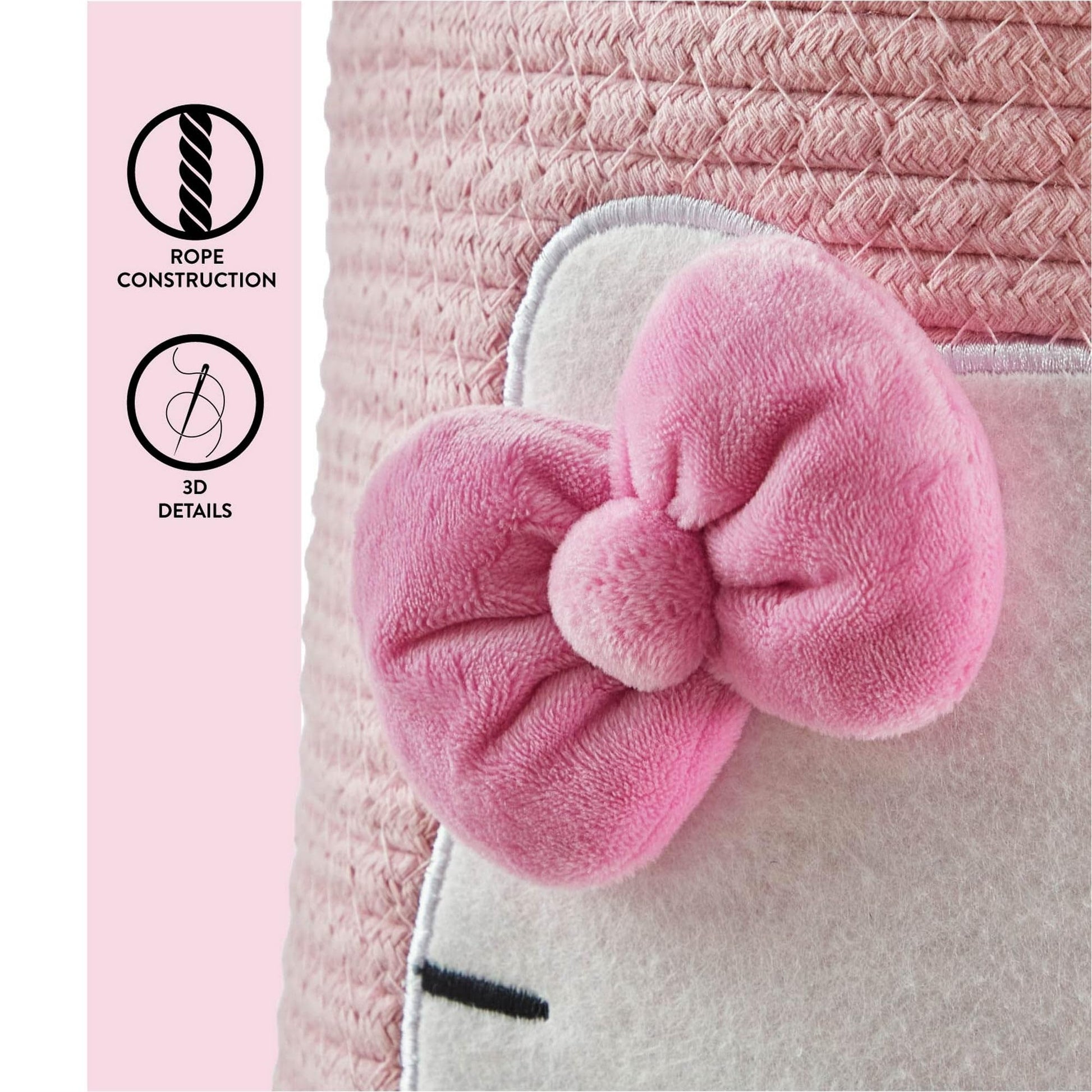Details: Add a touch of charm and organization to your home with the Sanrio Hello Kitty Rope Storage Basket. This adorable storage bin features the beloved Hello Kitty face with a plush pink bow, making it a delightful addition to any room. Designed for both style and functionality, this woven basket is perfect for keeping toys, clothes, blankets, or other essentials neatly organized.
