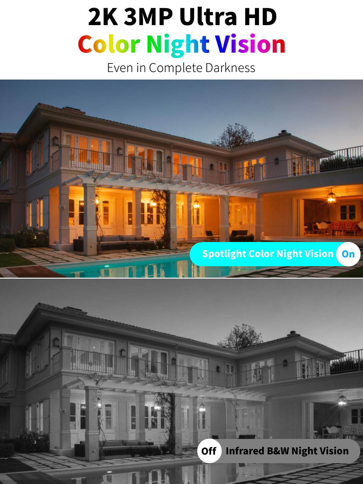 • 2K QHD Video & 33ft Color Night Vision - The ieGeek ZS-GX3S camera offers a high-resolution 3MP image quality, 1.5 times more detail than traditional 1080p cameras. 2 PIR LEDs and 2 white lights, 130° wide-angle lens and 33ft night vision range, allowing you to monitor more distant, wider and clearer environments, day or night.
