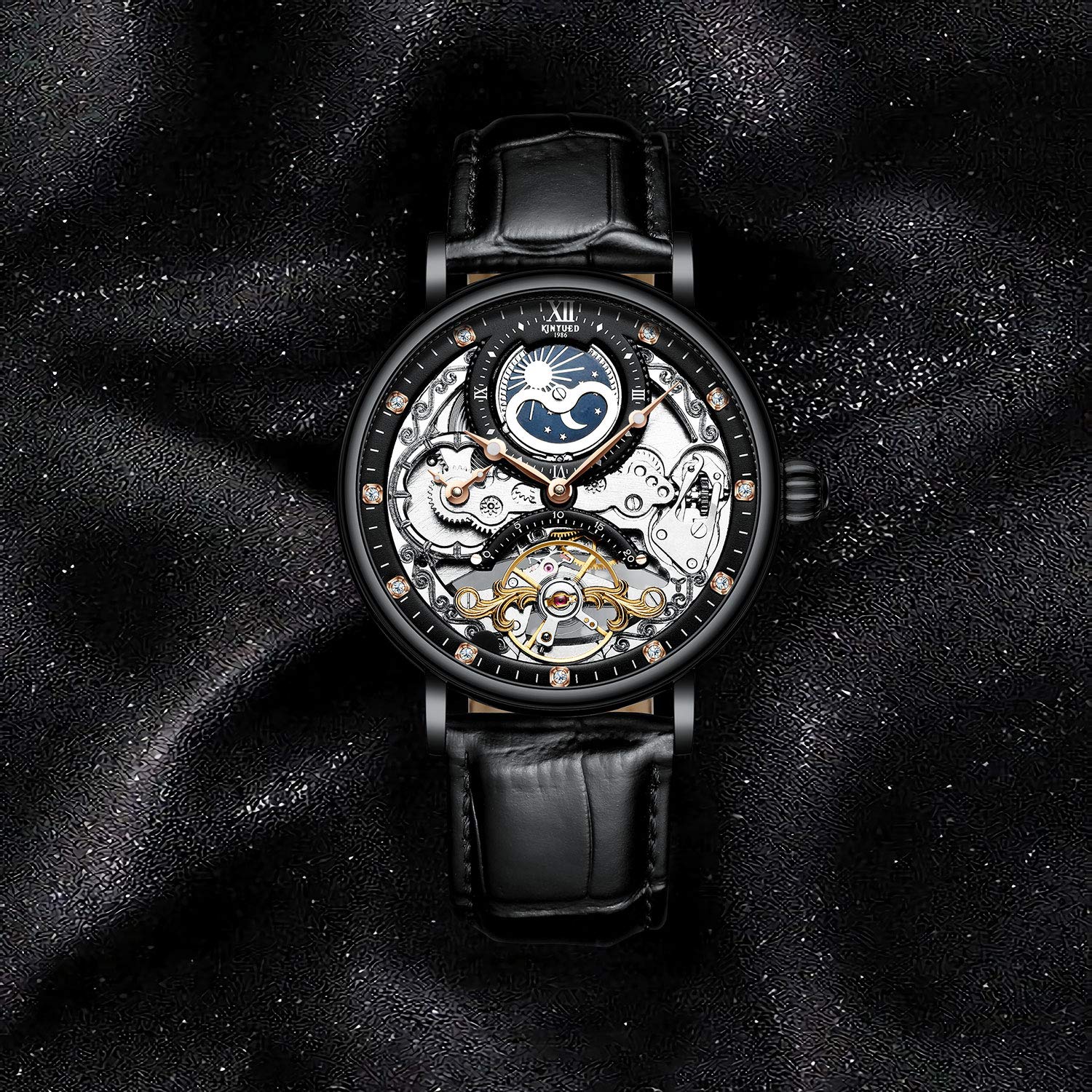 • SMALL BUDY, BUT VERSATILE:uality brand original automatic tourbillon style relojes de hombre(watch); without a battery; calendar,waterproof, moon phase function.
