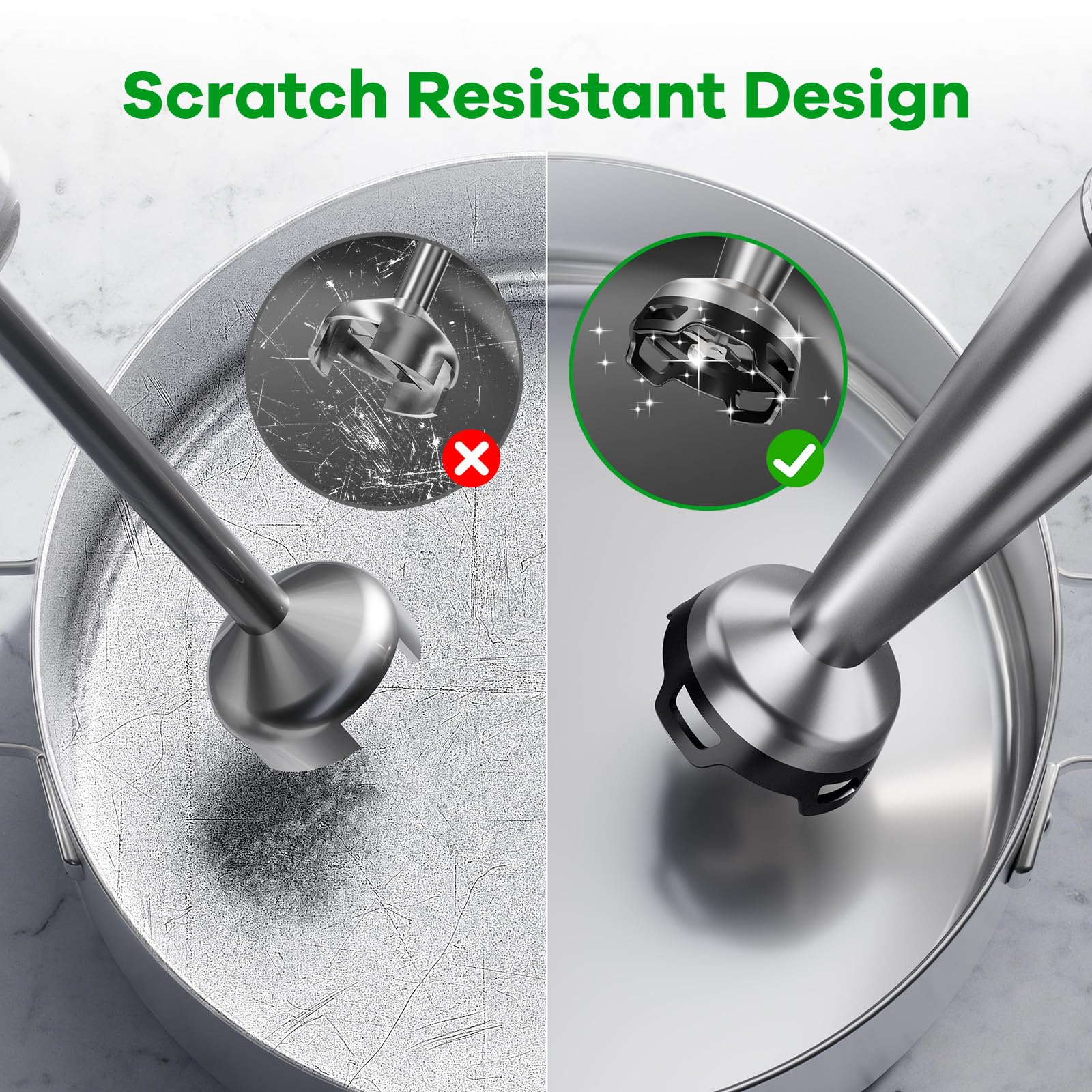 • Effortless Clean-Up, Scratch-Free: Features a unique food-grade nylon blade guard designed to minimize suction, preventing scratches on your pots and pans and keeping splashes at bay for a cleaner kitchen and hassle-free clean-up