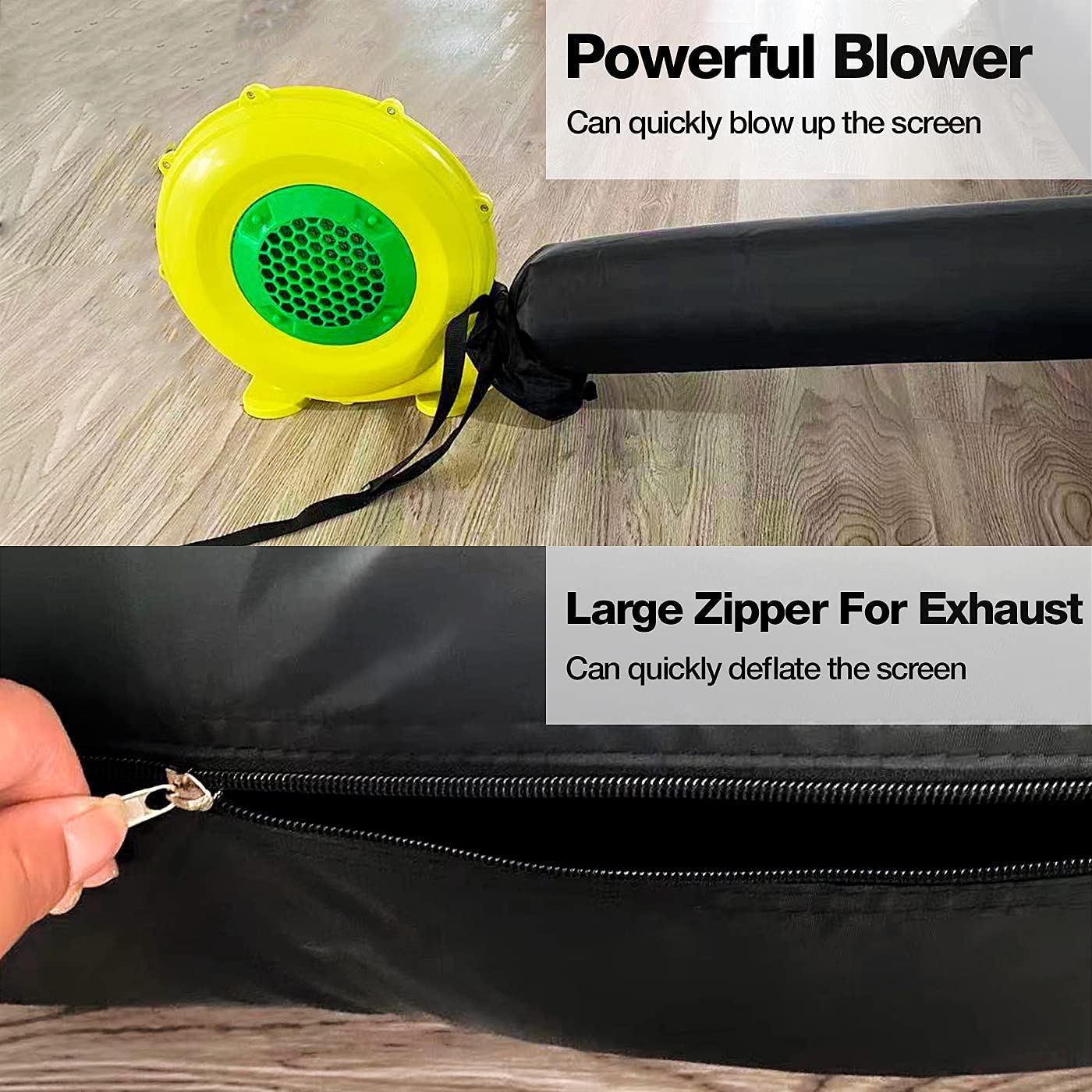 • 【Quick Inflated】Our inflatable movie projector screen come with powerful air blower, the outdoor projector screen full inflation with low noise in around 2-3 minutes and keeps it inflated throughout the show when plugged in (REMEMBER zip up the zipper before inflating). The blower sound was so hardly not obvious once the movie started, bring you an immersive movie-watching experience.