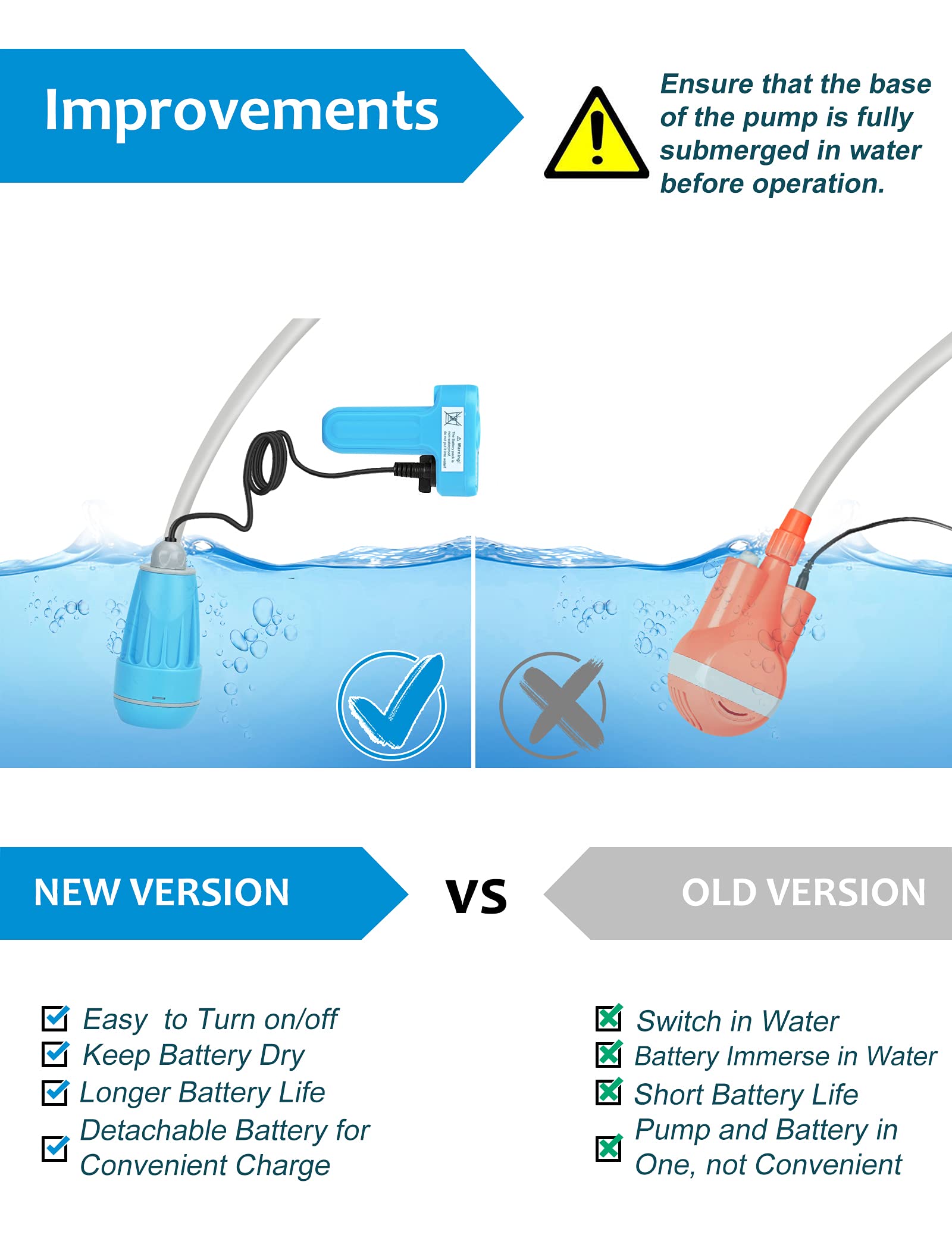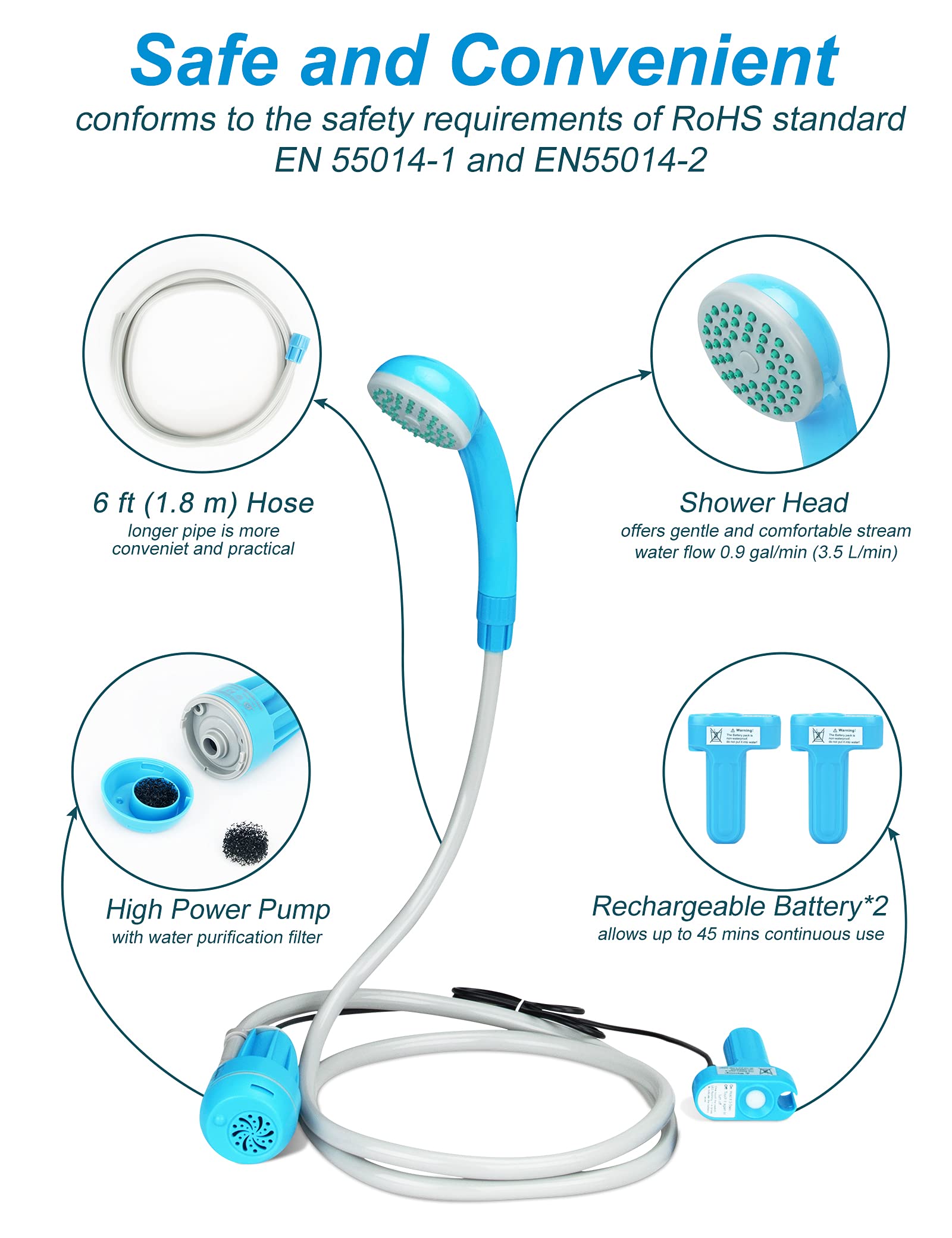 • EASY ASSEMBLY AND OPERATION: Attach pump and shower head to the hose. Fully immerse the pump in water and press the switch on battery to start. The camping shower offers gentle and comfortable stream at 0.9 gal/min (3.5 L/min).